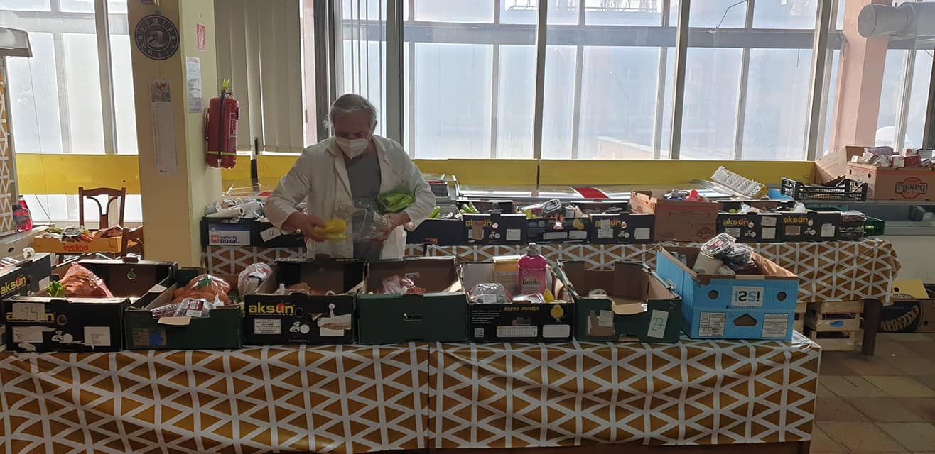 Jeden z dvoch pracovníkov sociálnej výdajne rozdeľuje do krabíc potraviny pre tých, ktorí ich potrebujú...