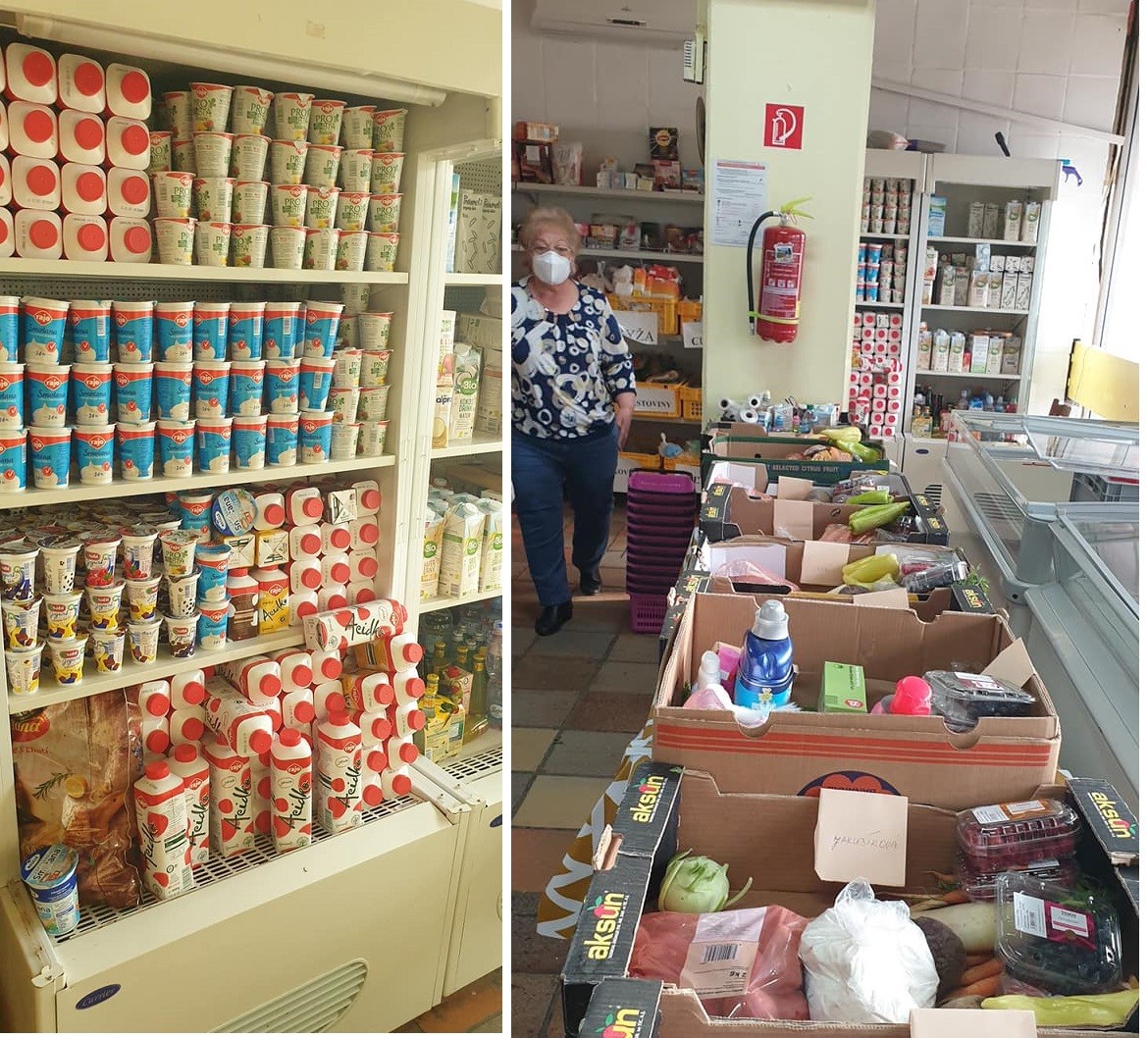 Mliečne výrobky skladujú v chladničke a v krabiciach sú už pripravené potraviny určené sociálne odkázaným...