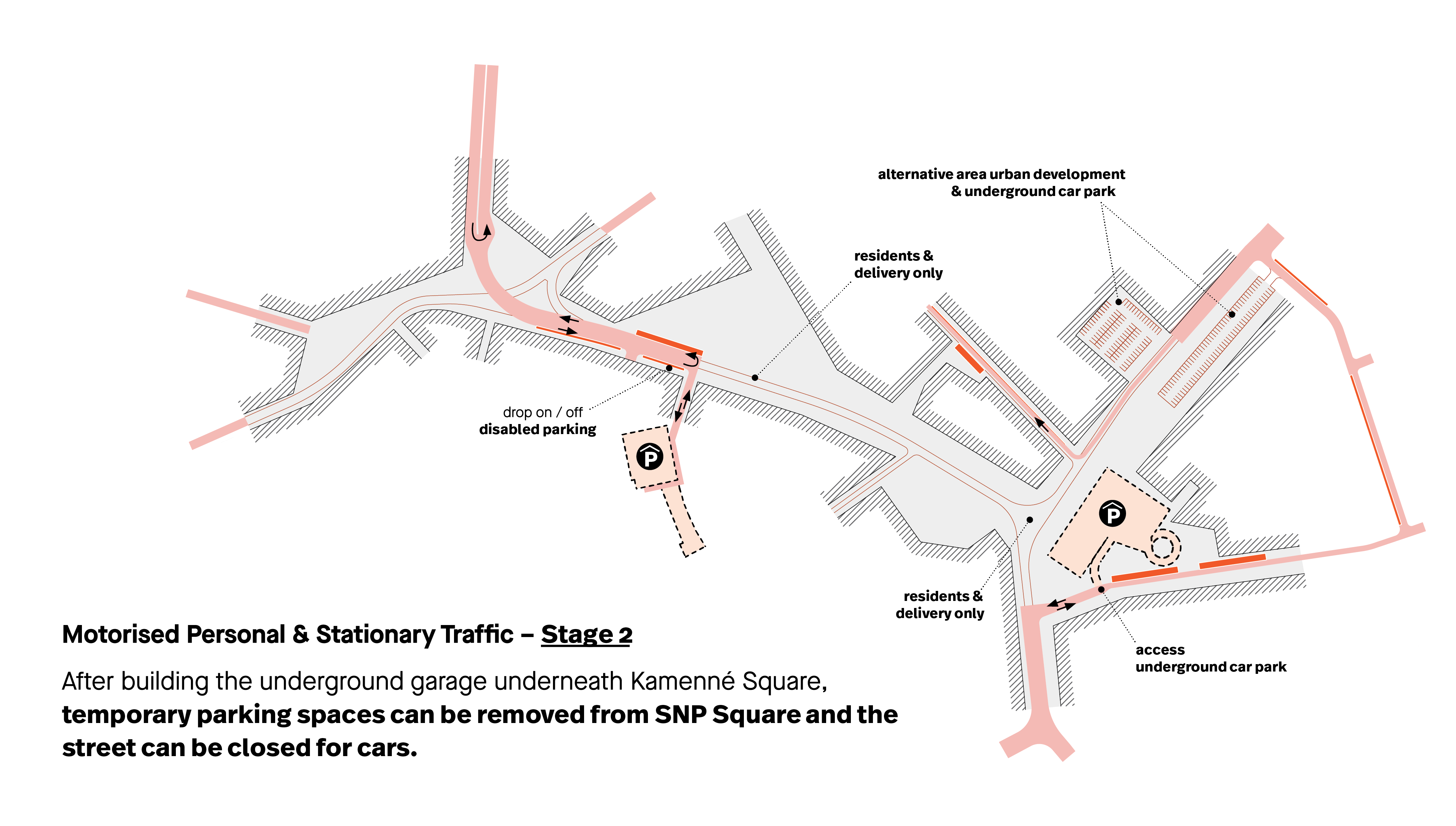 Doprave má pomôcť efektívnejšie využitie Dunajskej ulice a v poslednej fáze obnovy Živého námestia vytvorenie podzemného parkovania na území Kamenného námestia.