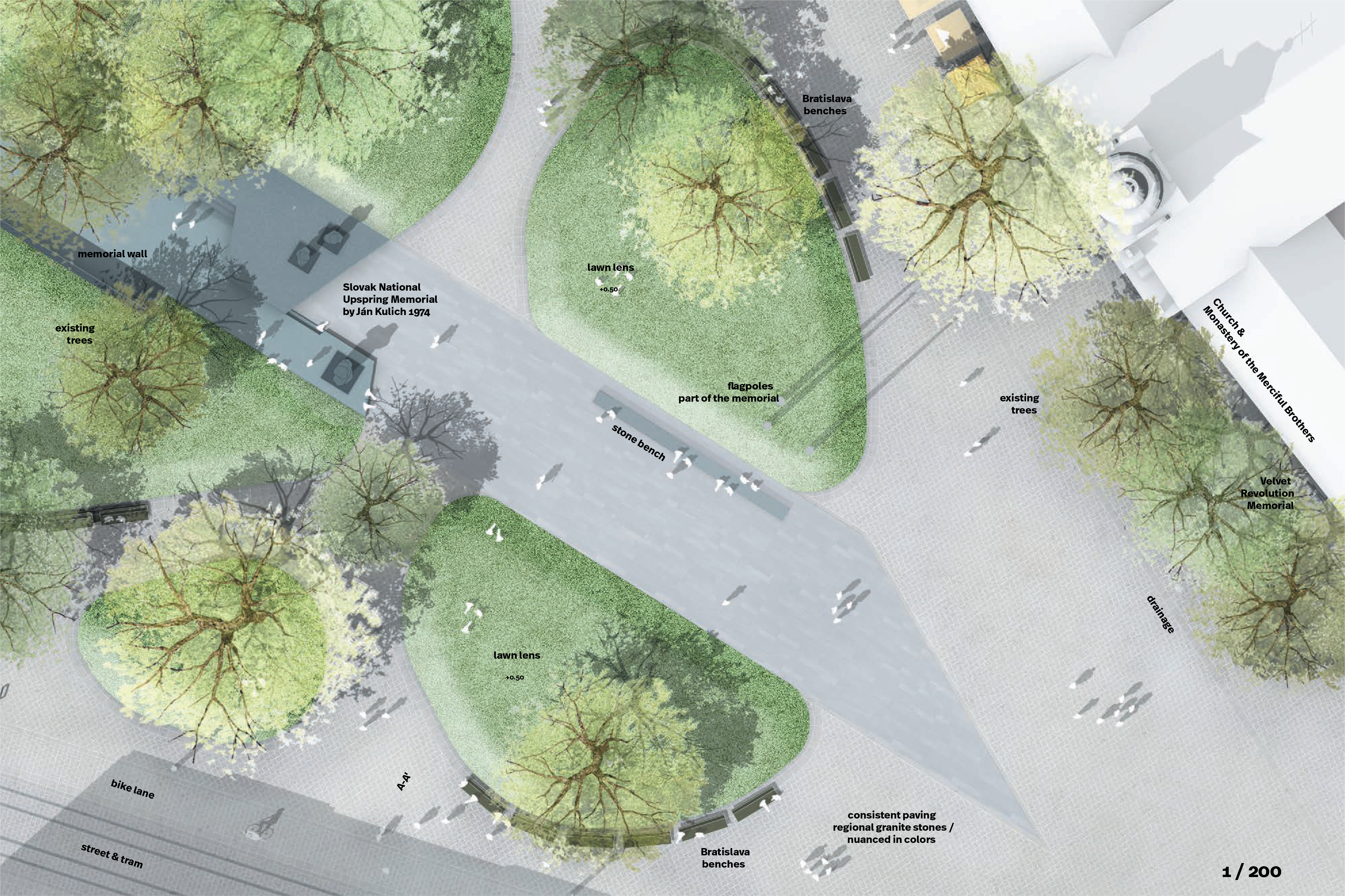 Súčasťou návrhu je riešenie okolia existujúceho pilieru Živého námestia, ktorým je Pamätník SNP. Návrh v hornej časti Námestia SNP vytvára nový prirodzený chodník popred Pamätník, čím zjednoduší trasu ľudí smerujúcich do historického centra. Návrh zachováva charakter pamätníka, rešpektuje pietnu funkciu, a pritom navráti Námestiu SNP stretávaciu funkciu.