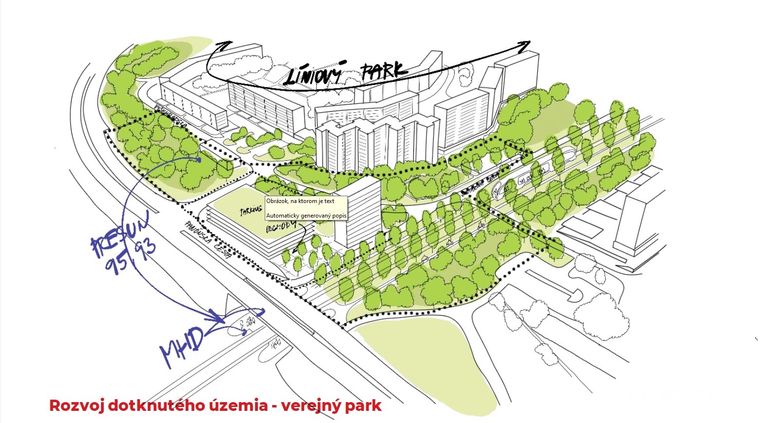Čo by teda v priestore, kde je dnes najmä trávnatá plocha, malo pribudnúť? Obytný dom s približne 100 až 130 bytmi, občianska vybavenosť ako obchody a služby a parkovací dom s 500 parkovacími miestami.