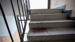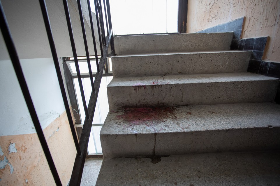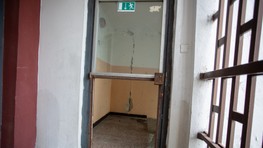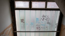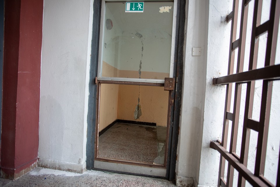 Dvere pri schodiskách majú vymlátené sklenené výplne.