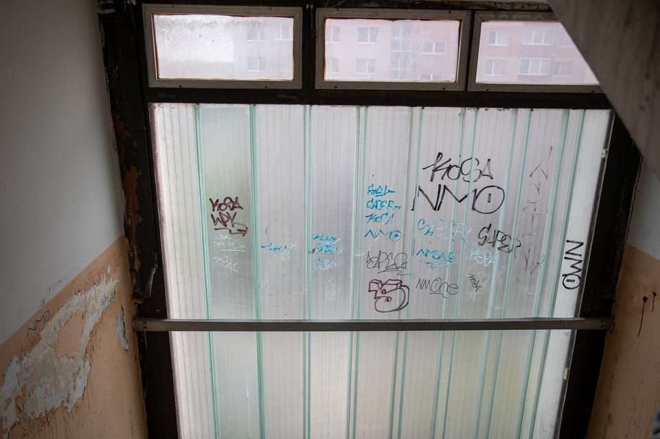 Do žiadneho z bytov sa nedostaneme, ale stačí nám prejsť sa aj po spoločných priestoroch, aby sme videli rozpad v priamom prenose. Strecha sa roky len plátala, je preliačená, s mlákami vody, zhrdzavenými odtokmi, do domu na hornom poschodí zateká. Schádzame po schodisku. Mnohé schodiskové dvere sú bez sklených výplní, je tu neporiadok, zvyšky jedál na schodoch, steny pomaľované, ľudia nechávajú nepotrebný nábytok na medziposchodiach rovnako bezproblémovo ako pred kontajnerovým stojiskom... „Stále sa tu niečo opravuje. Bytový podnik opraví vykopnuté dvere, o dva dni sú znova v rovnakom stave. Vymaľujeme, o mesiac sú steny posprejované...“ konštatuje Miroslav Dragun, ktorý je zároveň predseda dozornej rady Bytového podniku Petržalka. „Nájomcovia si ničia vlastný dom.“