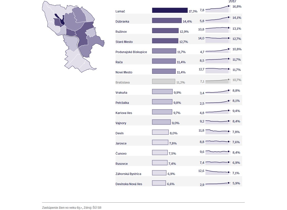 Vizualizácie ukazujú aj vývoj populácie seniorov. Napríklad najvyšší podiel žien nad 65 rokov je v bratislavskom Lamači, kde tvoria viac ako šestinu obyvateľstva tejto mestskej časti.
