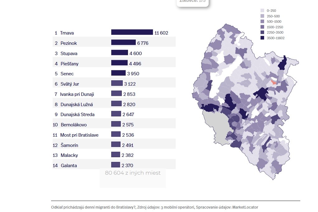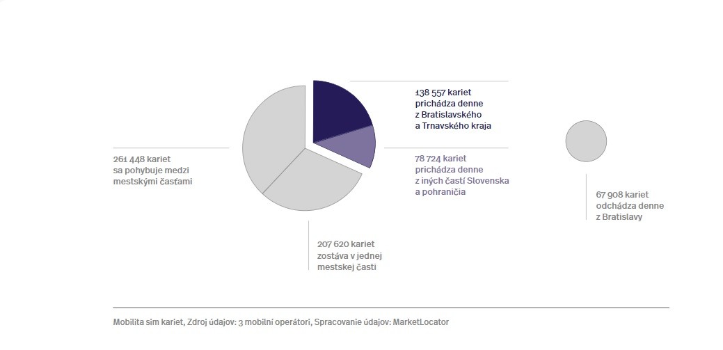 Z grafov možno tiež odčítať, že do Bratislavy denne dochádza takmer 140-tisíc SIM kariet (niektorí ľudia môžu mať aj viac zariadení). Ukazujú to dáta od mobilných operátov. Najviac „pendlerov“ prichádza z Trnavy, Pezinka, Stupavy a Piešťan.
