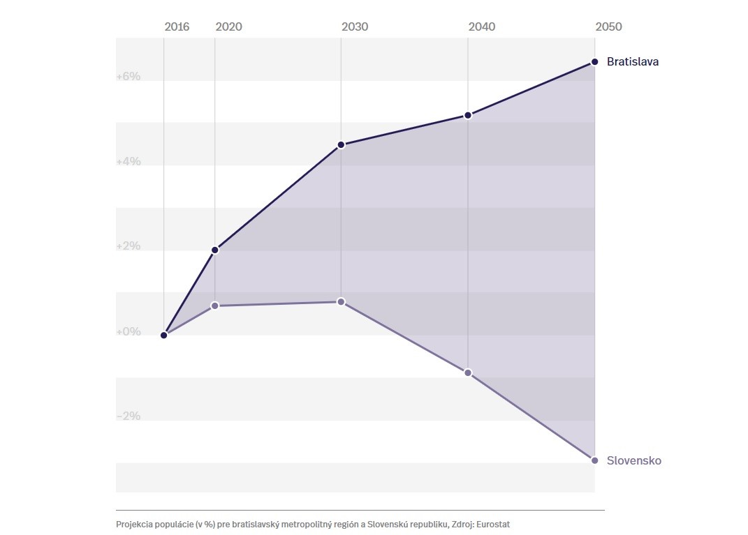 Rozdiel v populačnej dynamike medzi metropolitným regiónom Bratislavy a zvyškom krajiny sa v najbližších rokoch pravdepodobne prehĺbi, pretože hlavné mesto demograficky odčerpáva ostatné územie, hlavne regióny.