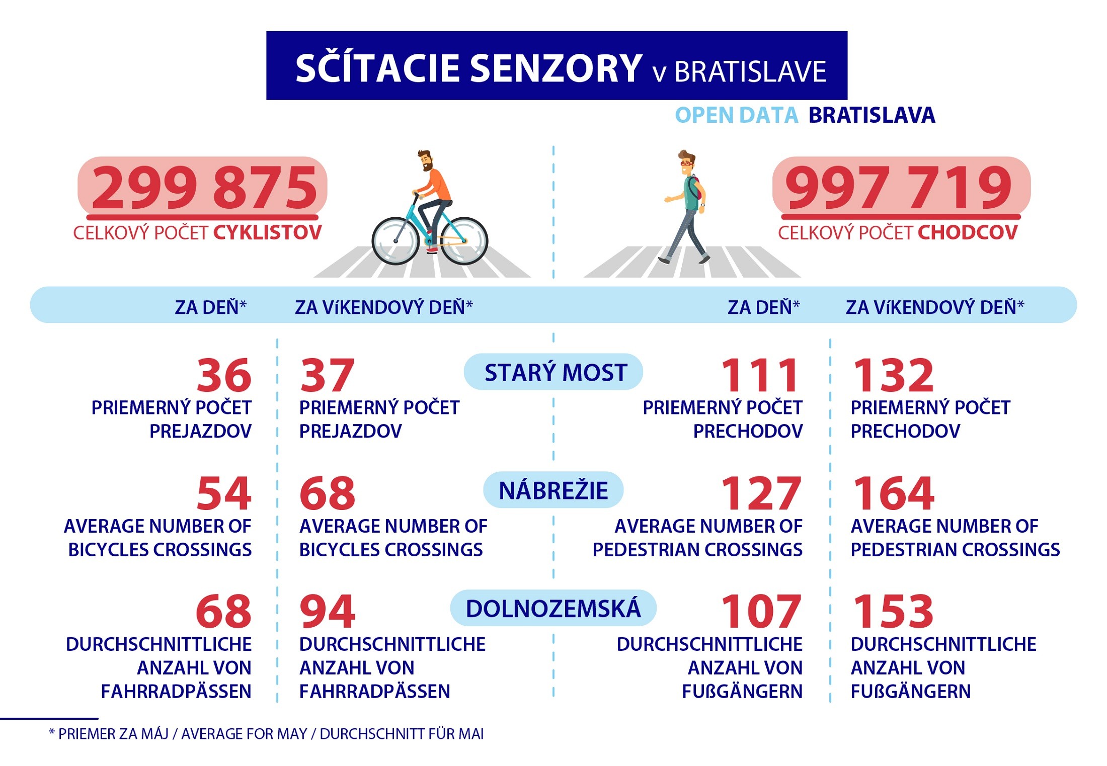 V hlavnom meste aktuálne fungujú tri sčítacie senzory pre chodcov - na Starom moste, na Dvořákovom nábreží a na Dolnozemskej ulici. Ide o viacsenzorové zariadenia, ktoré zbierajú informácie o počte prejazdov bicyklom, o počte prechodov chodcov a aj o kvalite ovzdušia na danom mieste.
