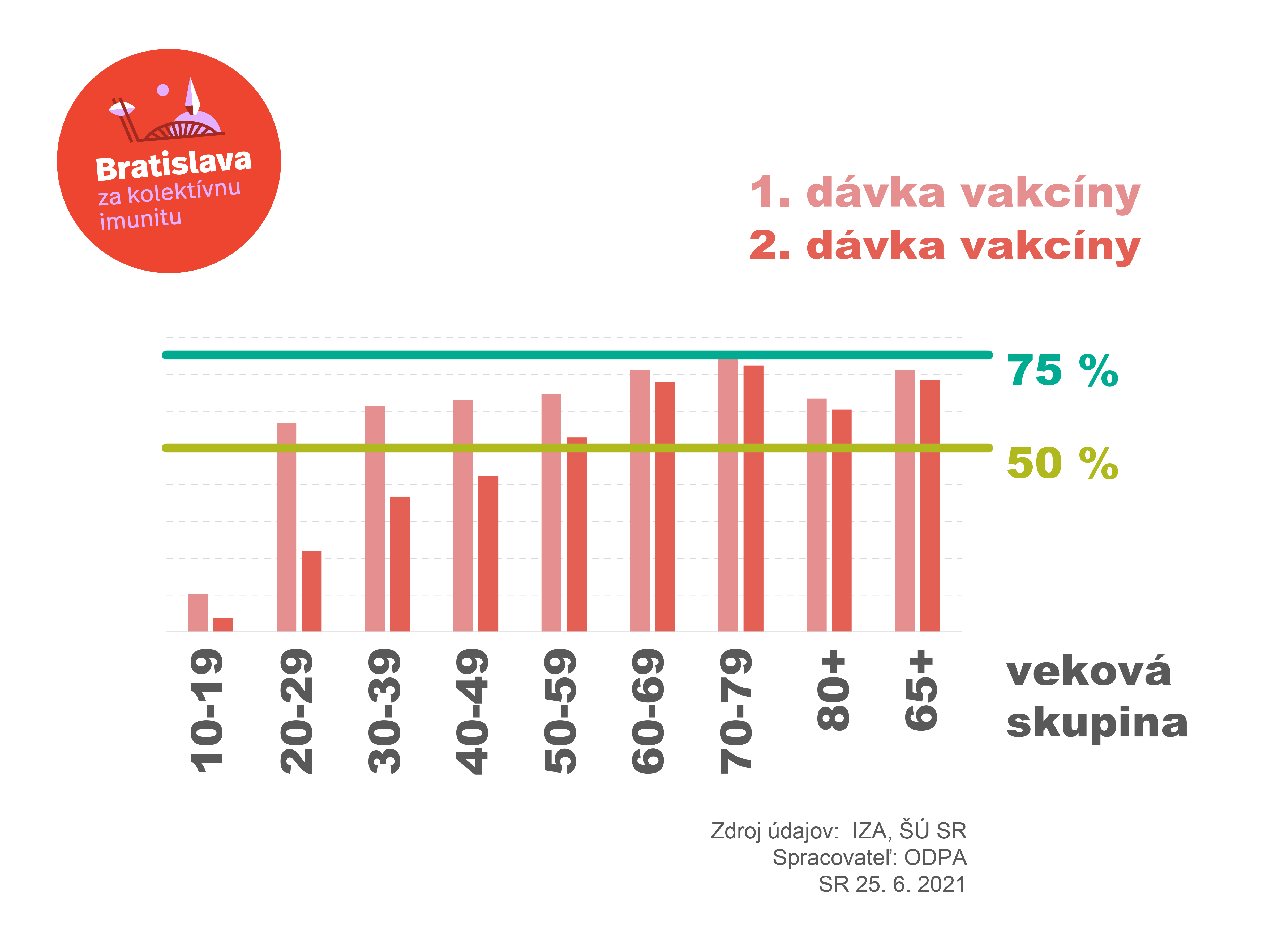 Podľa aktuálnych údajov rezortu zdravotníctva je dnes v Bratislave zaočkovaných prvou dávkou vakcíny 52,5 % obyvateľov a druhou dávkou 39,9 % obyvateľov[1].