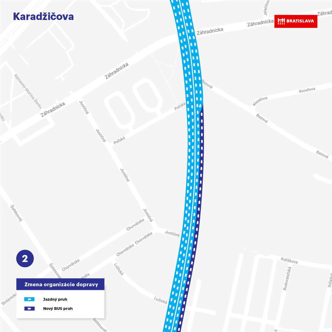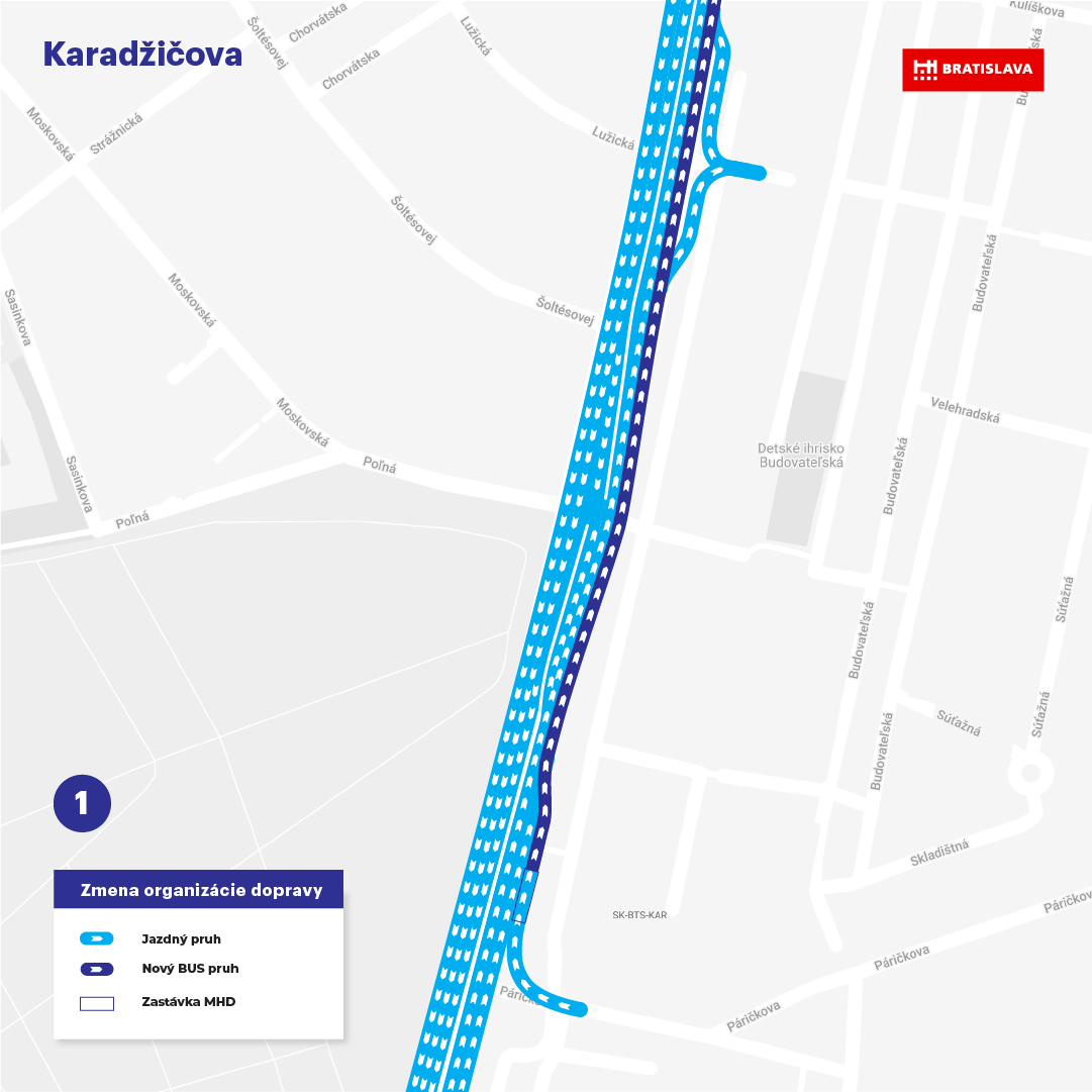 Od pondelka 19.7. mesto začne s vyznačovaním bus pruhov na Karadžičovej a Legionárskej v smere od ulice Mlynské Nivy po Račianske mýto. V tomto úseku premáva v dopravnej špičke 37 spojov verejnej hromadnej dopravy s prepravnou kapacitou 2900 cestujúcich. Magistrát zmeny avizoval na sociálnej sieti.