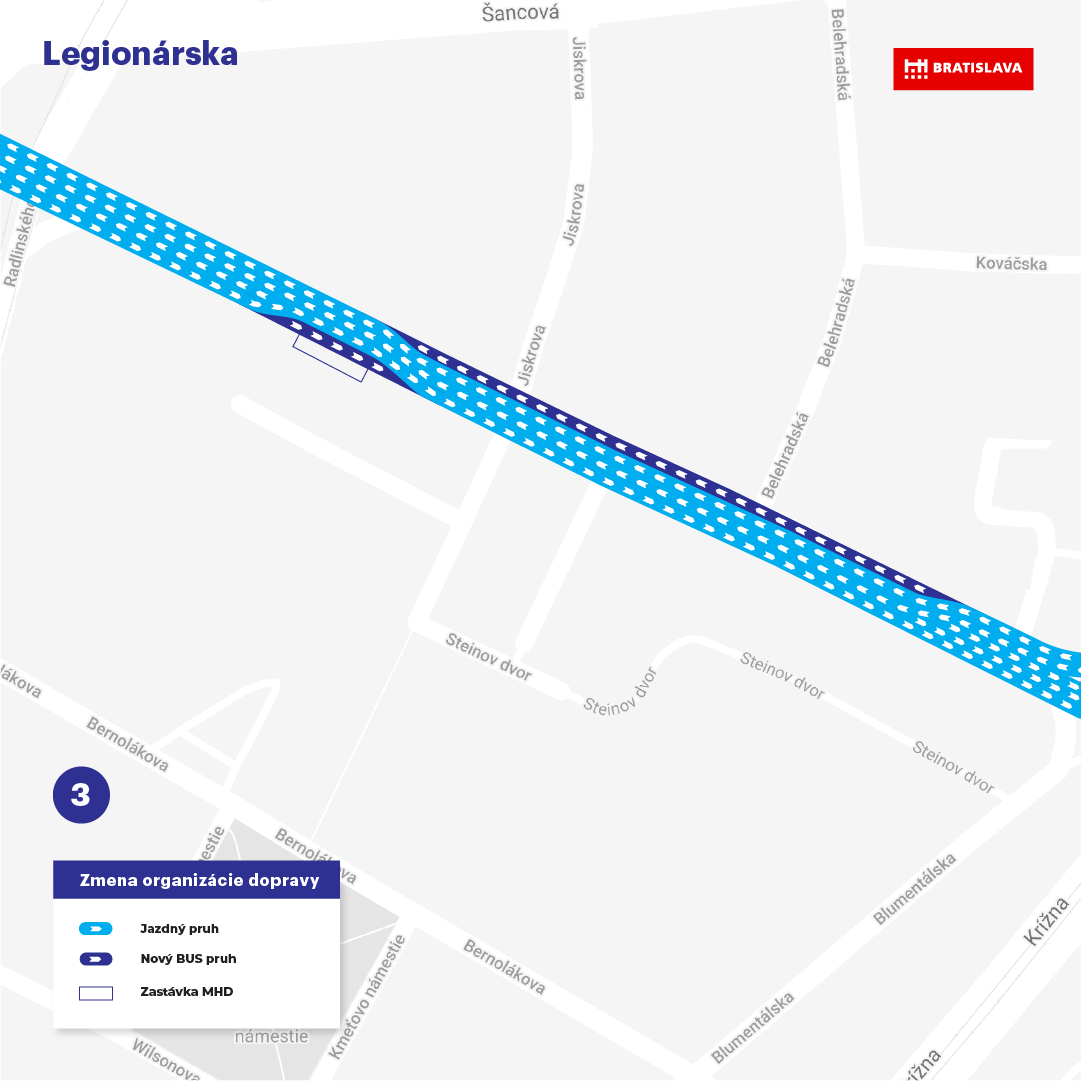 Mesto avizuje pre zachovanie dopravnej kapacity na Legionárskej -v smere od Krížnej na Račianske mýto, k existujúcim dvom jazdným pruhom pre automobilovú dopravu tretí pruh pre verejnú dopravu. "Aby v tomto smere mohli vzniknúť 3 pruhy, šírka komunikácie v opačnom smere (od Račianskeho mýta na Krížnu) bude znížená a na väčšine úseku bude iba jeden jazdný pruh pre všetky vozidlá," riblížil magistrát s tým, že táto zmena by nemala mať negatívny dopad na dopravu, nakoľko už dnes sa doprava od Račianskeho mýta na Legionársku napája v jednom jazdnom pruhu a pred križovatkou s Krížnou bude zachovaný súčasný počet jazdných pruhov.