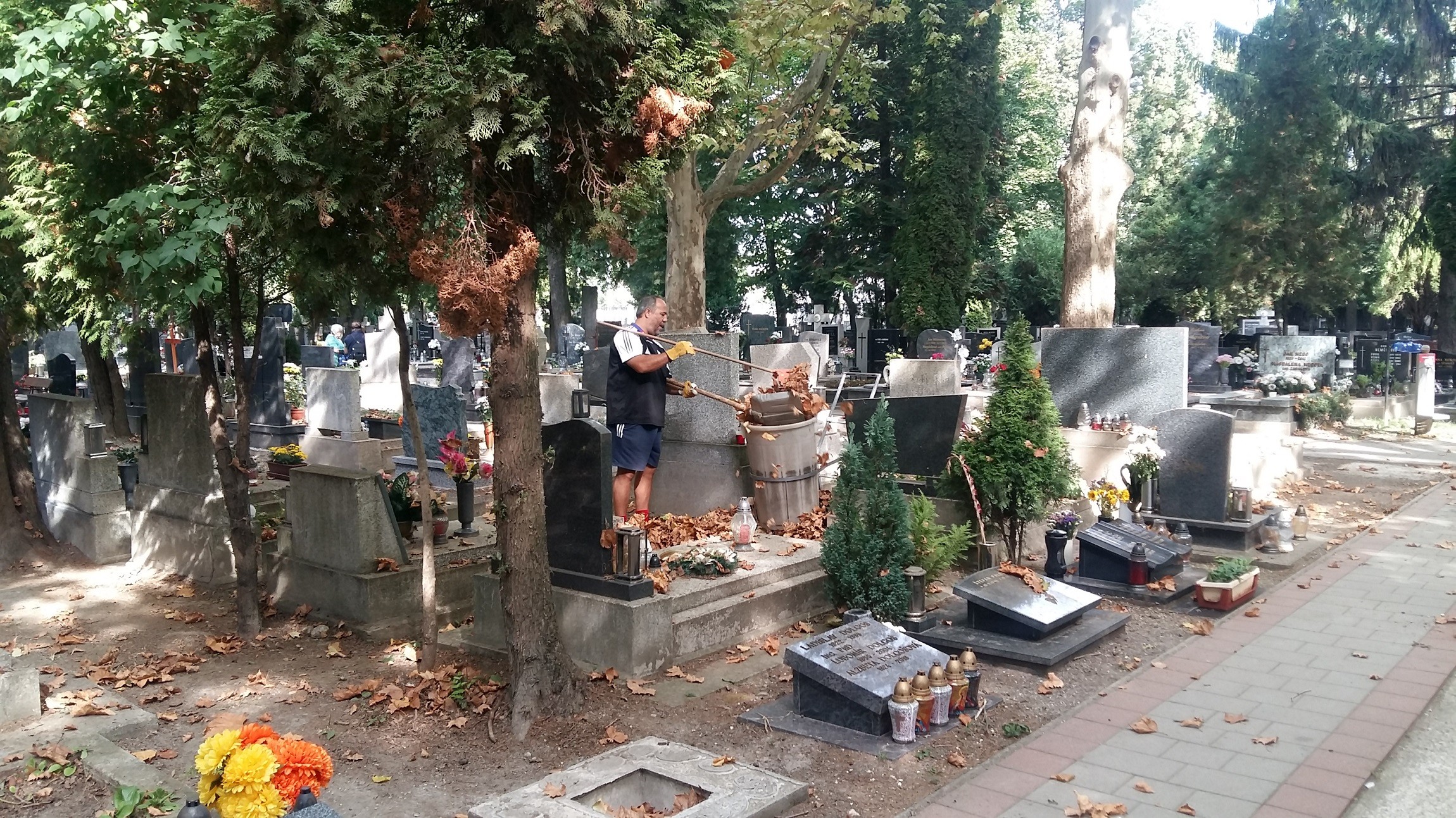 Pri jej sťažnostiach na zber lístia, oponujeme. Nemôžeme chcieť naraz na cintorínoch aj stromy, aj mať hroby na jeseň celkom bez listov. V čase našej návštevy zamestnanec cintorína listy zbieral. Aj jeho snaha má však svoje limity.