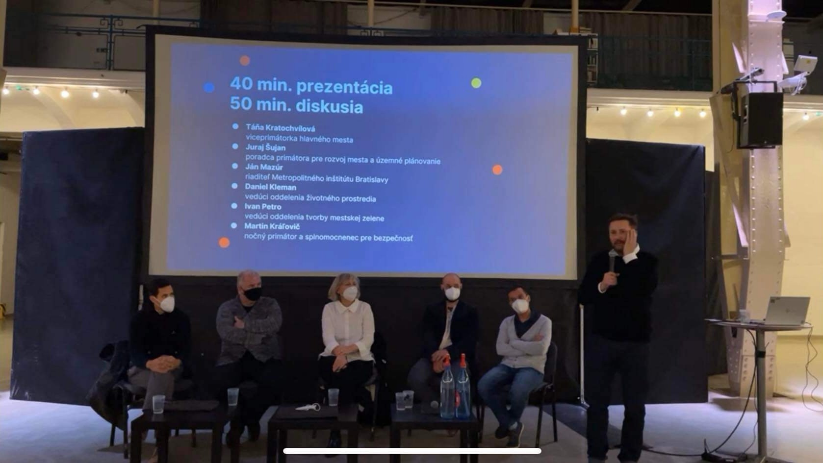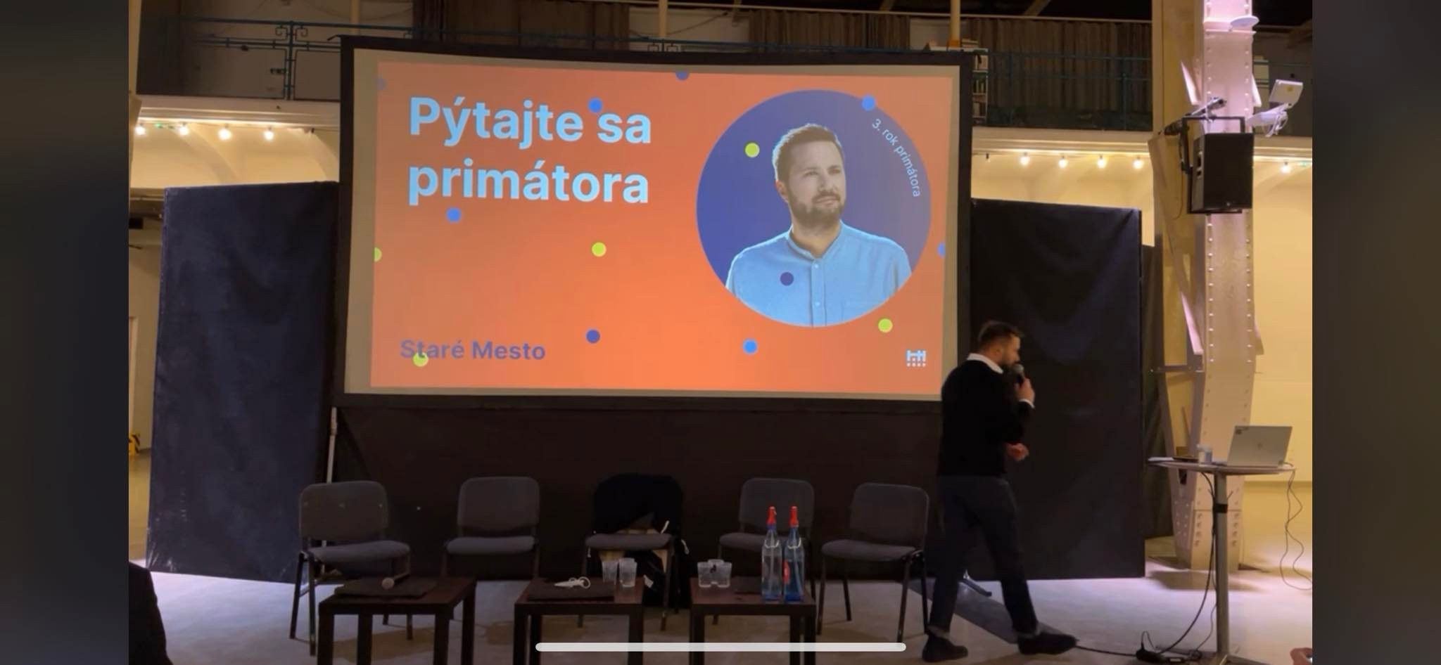 Vallo prišiel na dvojhodinú akciu najskôr s respirátorom, no zložil si ho. "Napriek tomu, že tá epidemiologická situácia je taká, aká je, som si dal dole rúško, som zaočkovaný, tento týždeň som absolvoval dva PCR testy a keď budú so mnou sedieť kolegovia, dám si ho späť," vysvetlil publiku. Fakt je, že pred ním sedeli obyvatelia Starého Mesta kladúci otázky a respirátor si na striedačku skladal i po tom, čo sa na pódiu nachádzali ďalší zúčastnení, ako vidno aj na úvodnej fotografii článku, ale aj tu: