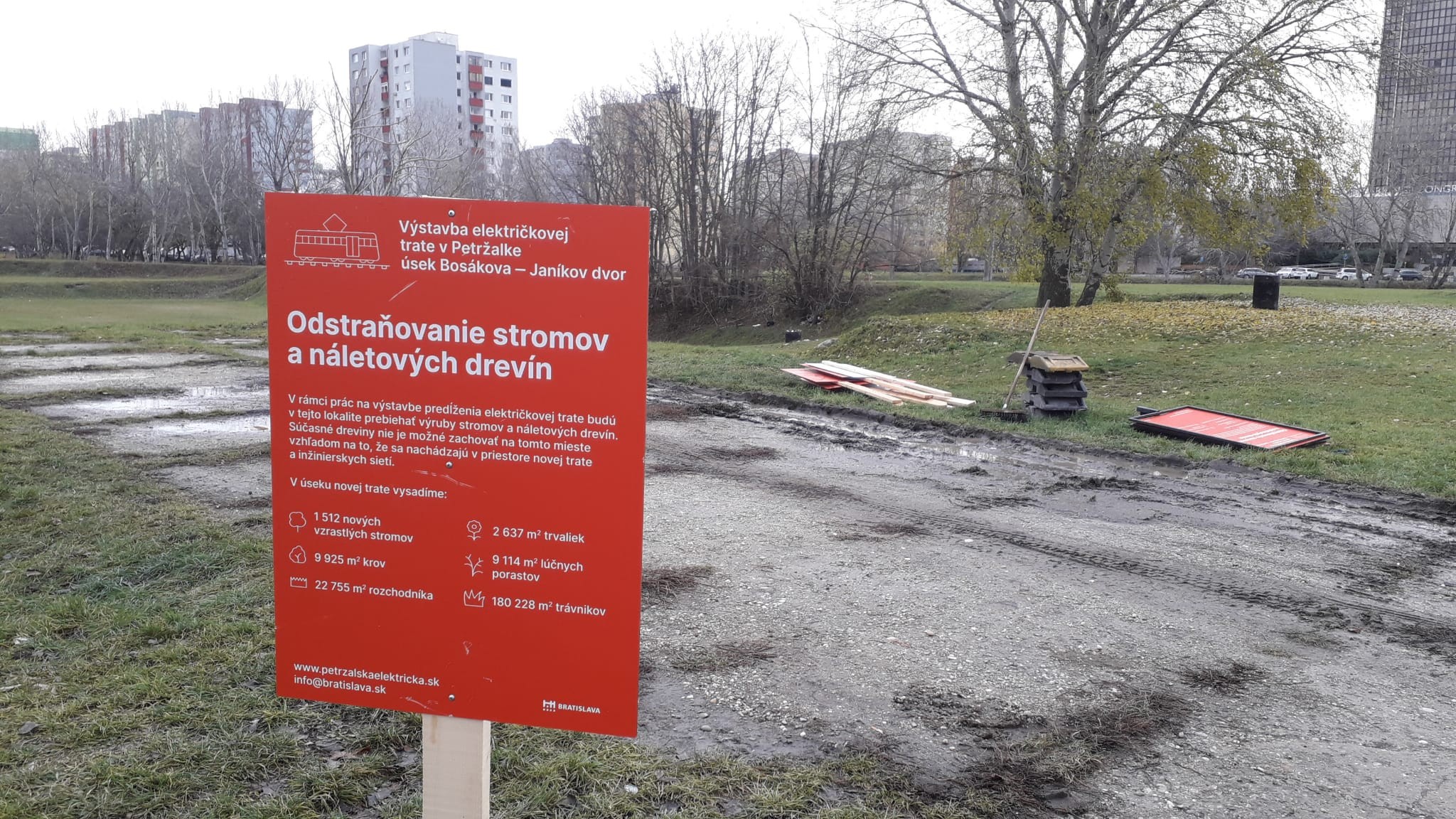 "Pozor, stavenisko. Zákaz vstupu nepovolaným osobám." Tento nápis na tabuli možno prekvapil niektorých Petržalčanov, ak prechádzali cez Námestie Jána Pavla II. Zároveň sa ľudia z ďalšej tabule môžu dozvedieť, že na mieste, kadiaľ povedie budúca trať, už prebieha výrub stromov a náletových drevín. "Súčasné dreviny nie je možné zachovať na tomto mieste, vzhľadom na to, že sa nachádzajú v priestore novej trate a inžinierskych sietí," informuje na tabuli mesto s tým, že na budúcej trati v úseku Bosákova - Janíkov dvor neskôr vysadia 1512 nových vzrastlých stromov, 9.925 štvorcových metrov kríkov, 22.755 štvorcových metrov rozchodníka, 9.114 štvorcových metrov lúčnych porastov a 180.228 štvorcových metrov trávnikov.