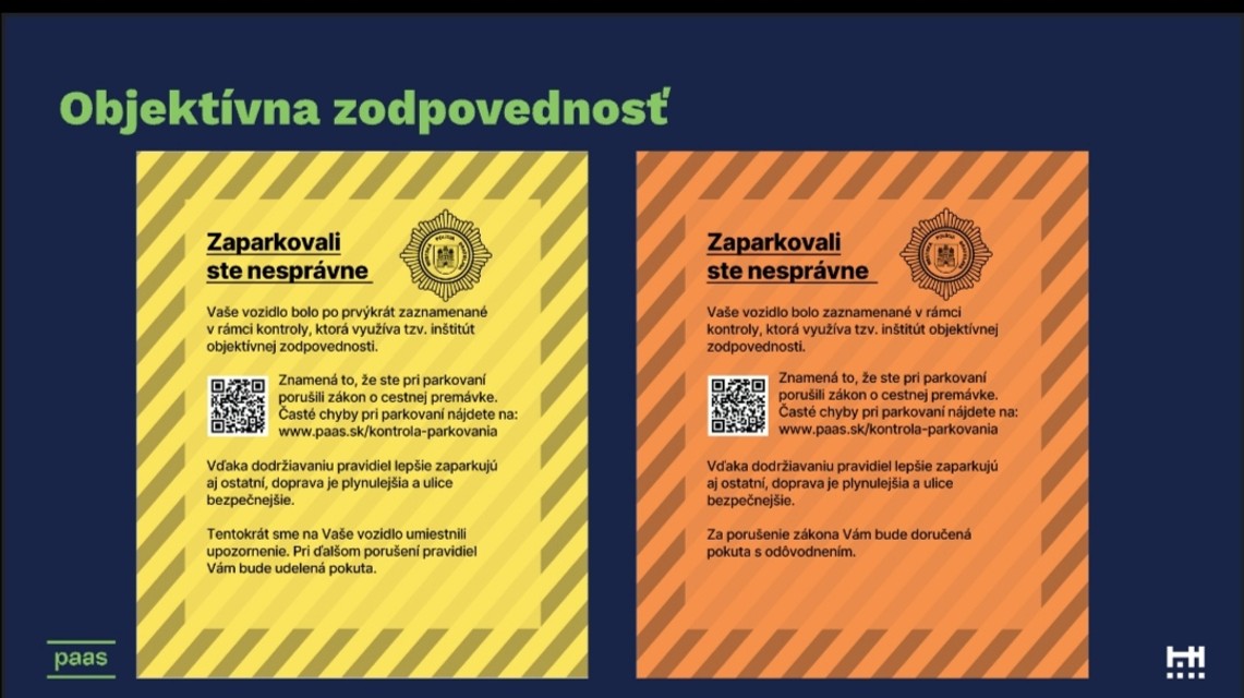 Kontrolu parkovania v jednotlivých zónach bude mesto realizovať prostredníctvom inštitútu objektívnej zodpovednosti. Kontrolovať budú priamo v teréne kontrolóri. Každú zónu skontrolujú za deň aj viackrát. Tento týždeň zle parkujúcim budú kontrolóri lepiť na autá "žltú nálepku" s upozornením, že vodič porušil pravidlá o parkovaní. Kontrolóri budú následne lepiť "oranžové nálepky", znamená to, že majiteľ už dostal pokutu.