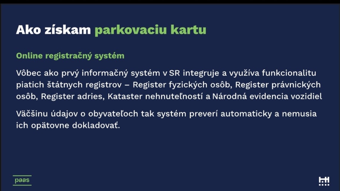 Systém prepája niekoľko iných systémov, napríklad kataster či evidenciu vozidiel, čo pre jeho užívateľov znamená zjednodušenie. Ak zadáte vaše EČV auta, okamžite vyhodnotí, o aké vozidlo ide. Ak je napríklad pridlhé či nemá STK, nezaparkujete.