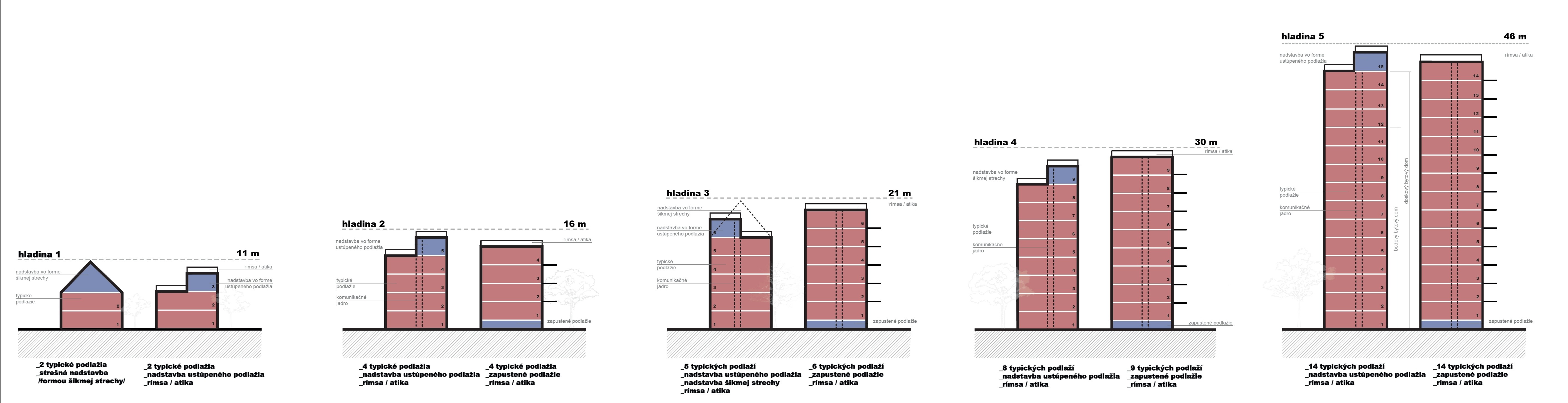 Mimo konkrétnych maximálnych výšok pre jednotlivé budovy, štúdia stanovuje pre urbanizovateľné územia päť výškových hladín*, podľa ktorých sa určí výška zástavby v danom území. Bratislava doteraz takéto zónovanie nemala. Podľa Metropolitného inštitútu ide o univerzálny, efektívny a ľahko aplikovateľný systém v rámci mesta. Každá výšková hladina sa odvíja od charakteristík terénu a pomáha vytvárať krajinu zohľadňujúcu prírodné danosti mesta. "V rámci prvej hladiny sa budú môcť postaviť budovy s maximálnou výškou 11 metrov, v rámci druhej 16 metrov, v rámci tretej 21 metrov, v rámci štvrtej 30 metrov a v rámci piatej hladiny 46 metrov," doplnila Schmucková. Práve stanovením výškových hladín sa má stabilizovať súčasný stav tak, aby bola zachovaná charakteristická mierka či už kompaktného mesta alebo obytných štvrtí a nedochádzalo k neprimeraným výškovým kontrastom pri novej výstavbe.