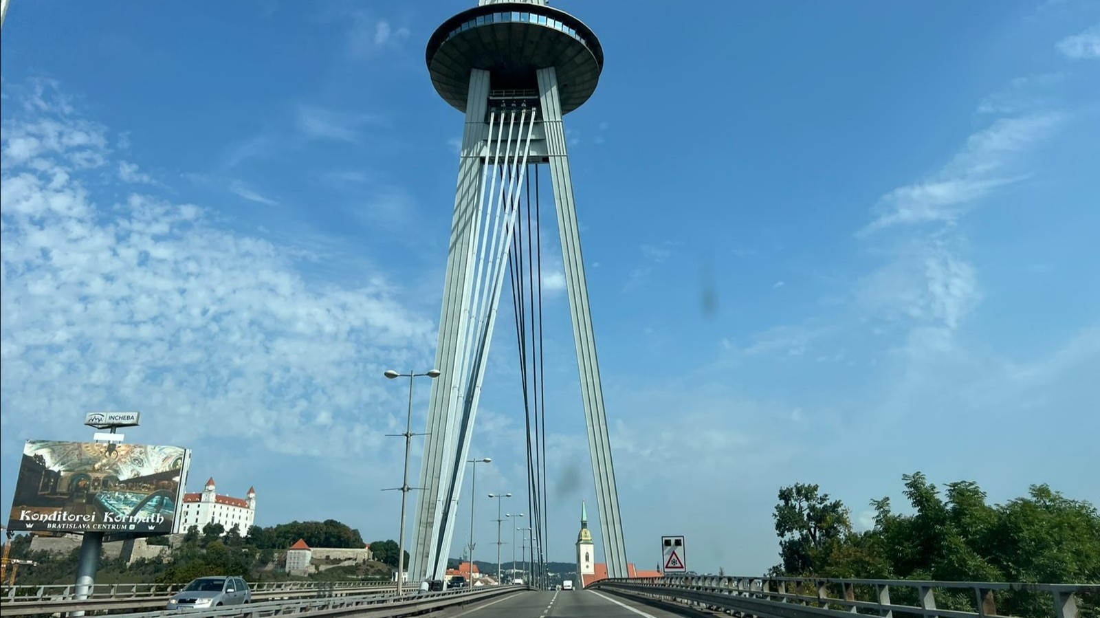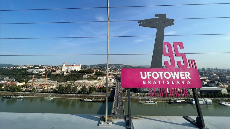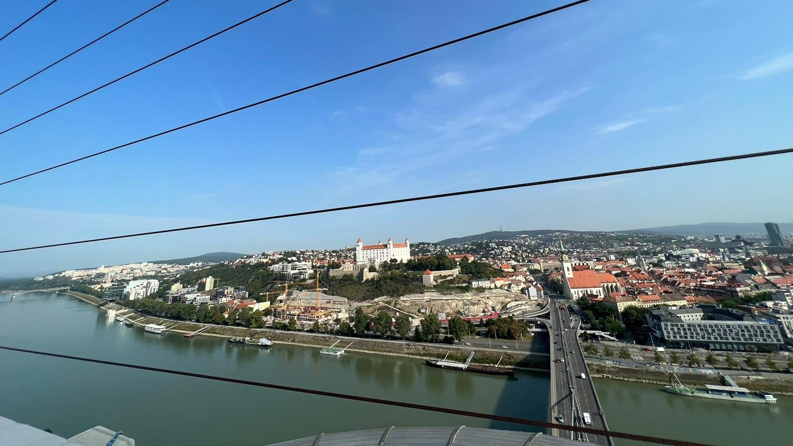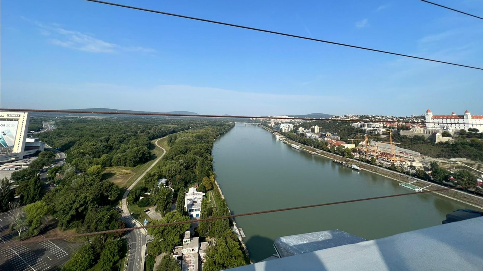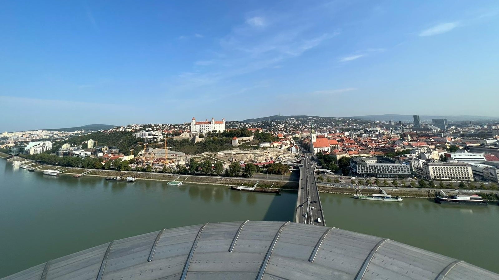 Panoramatický výhľad z vyhliadky Mosta SNP na našich západných susedov, rieku Dunaj vidíte v plnej kráse.