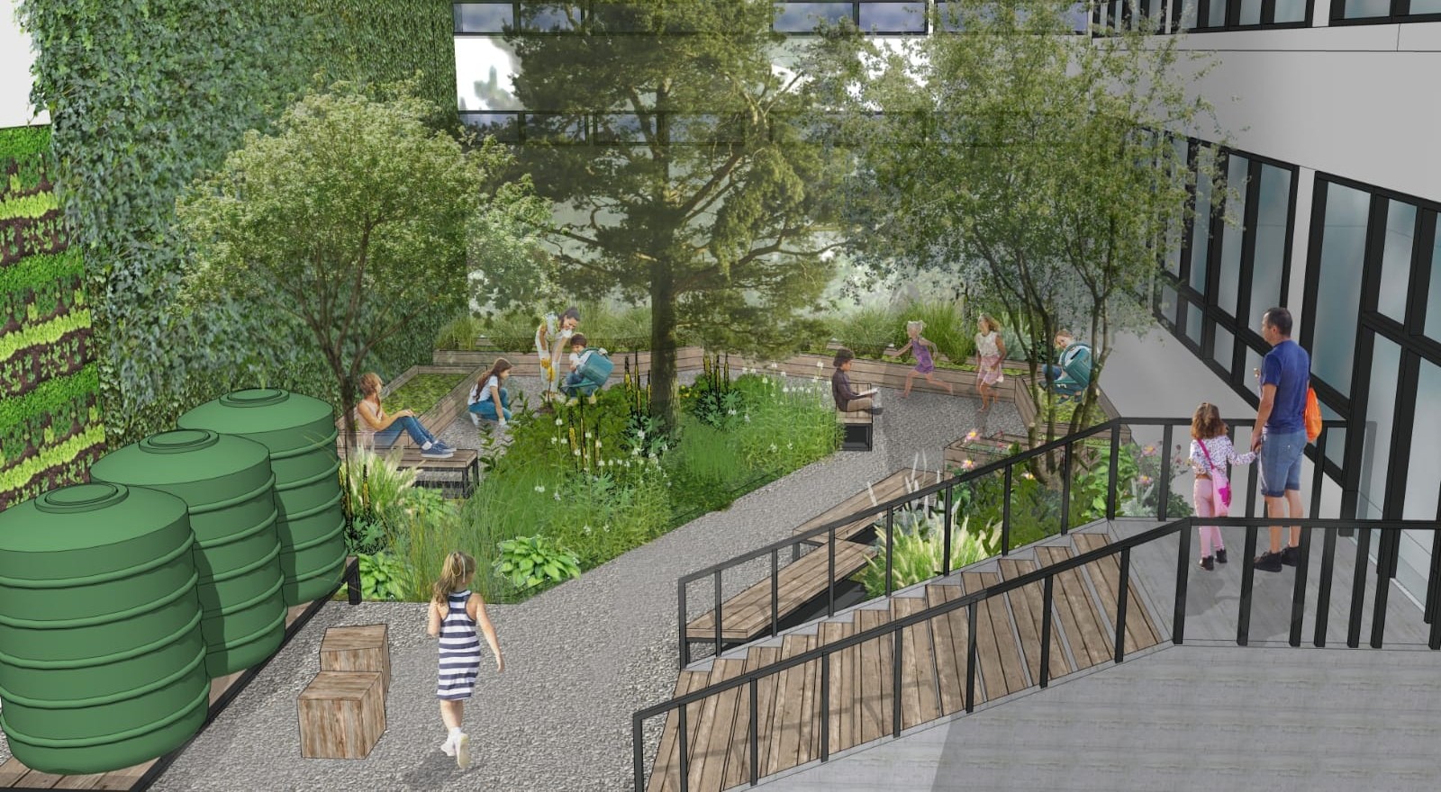 Veľká pozornosť sa v projekte venuje záhradnej architektúre, najmä vo vnútorných átriách, kde umiestnia popínavé rastliny, liečivé i jedlé rastliny. Súčasťou zrevitalizovaných átrií školy bude aj expozícia informačných panelov a interaktívnych 3D modelov, ktoré ilustrujú dôsledky klimatickej zmeny v sídlach a ukazujú opatrenia na jej zmiernenie a prispôsobenie sa jej dopadom.