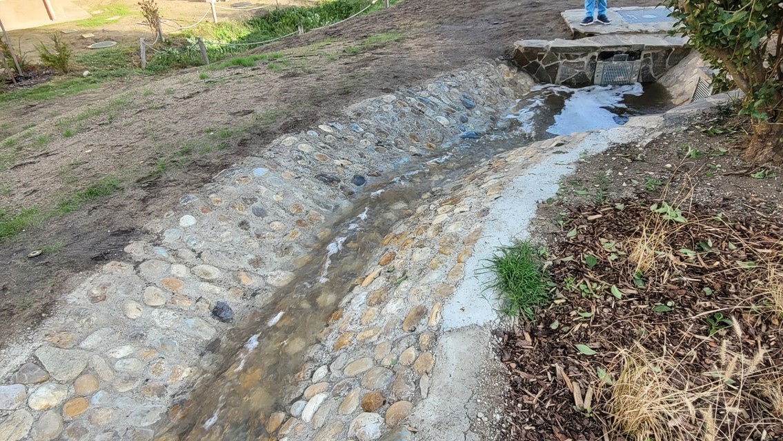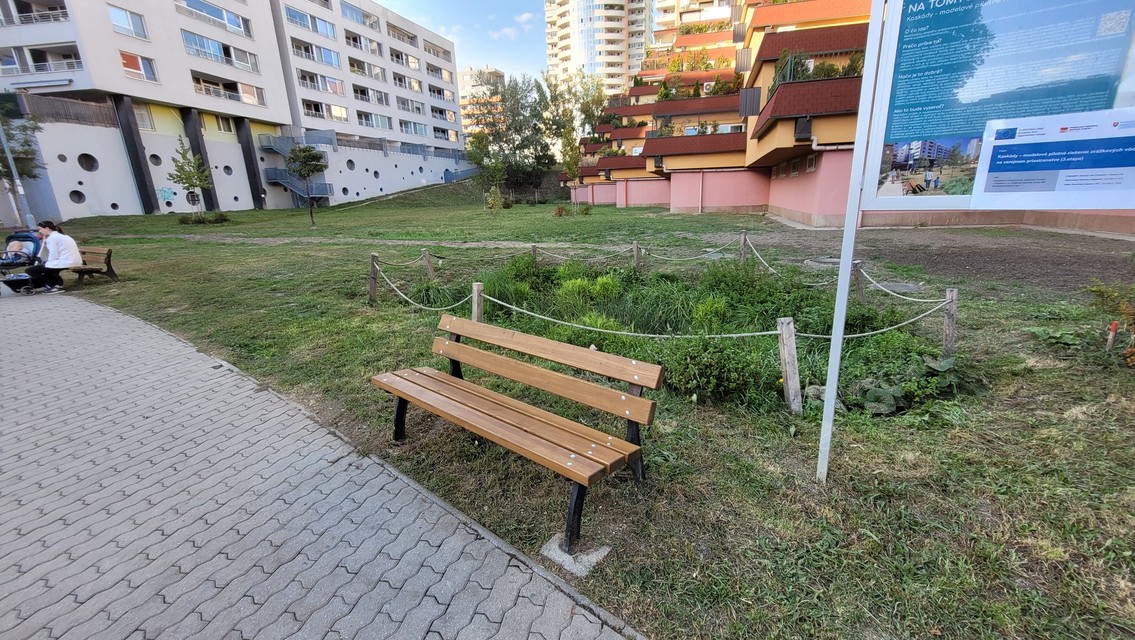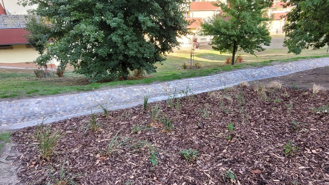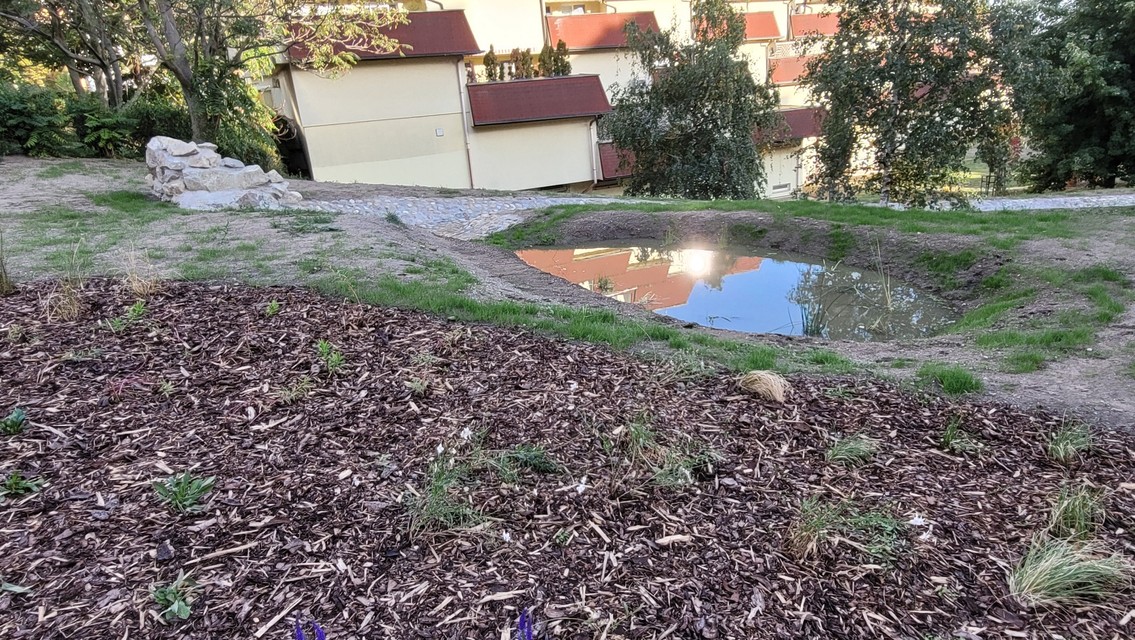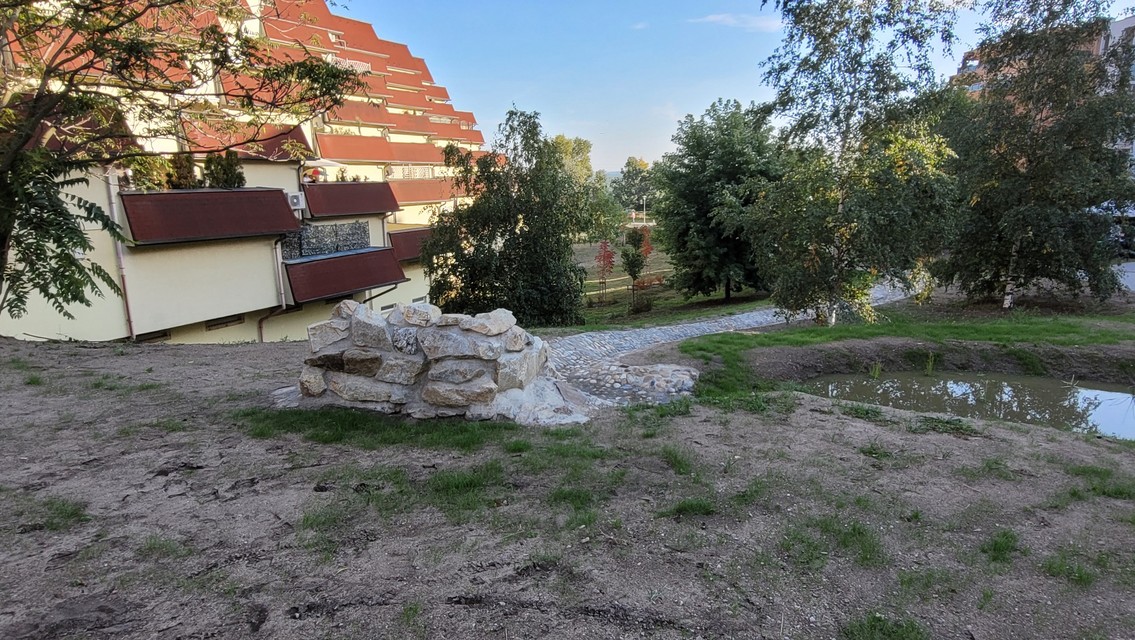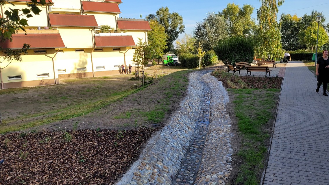 Vo vnútrobloku pribudli o nové dreviny a zeleň. Cez pozemok vedie umelý potôčik napájaný dažďovou vodou, na jeho konci nájdete vodný kútik s ručnou pumpou, mlynčekom, stavidlami, dreveným sudom a fontánou na osvieženie vzduchu. Vodná stavba je doplnená novovysadenou vegetáciou vodných rastlín v mokradiach.