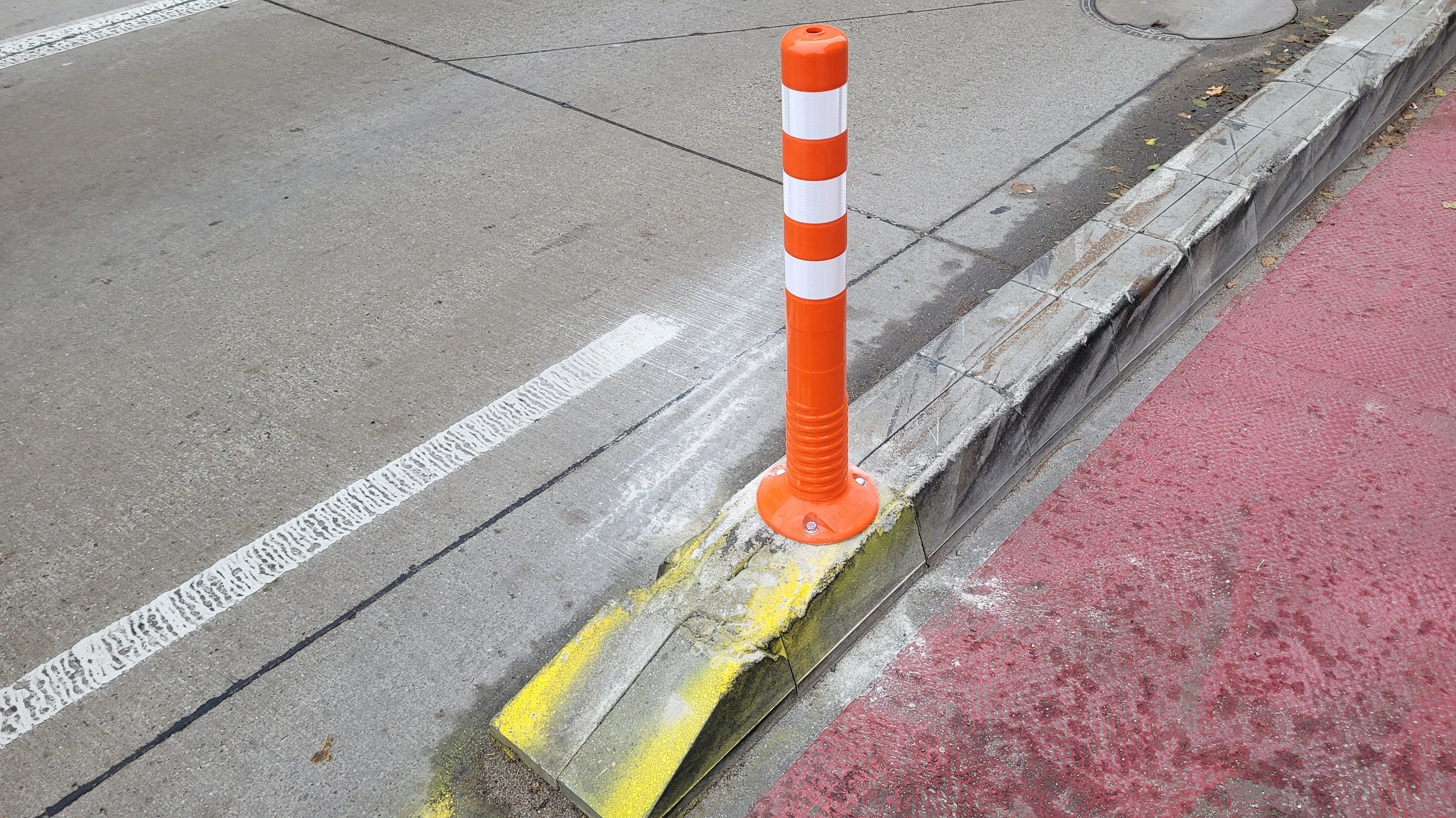 Počas dnešného dňa na betónové obrubníky osádzajú ľahké oranžové plastové stĺpiky s reflexnými pásmi. Sú umiestnené najmä pri vjazdoch a výjazdoch z bočných uličiek, kde je riziko kolízie auta s betónom najvyššie.