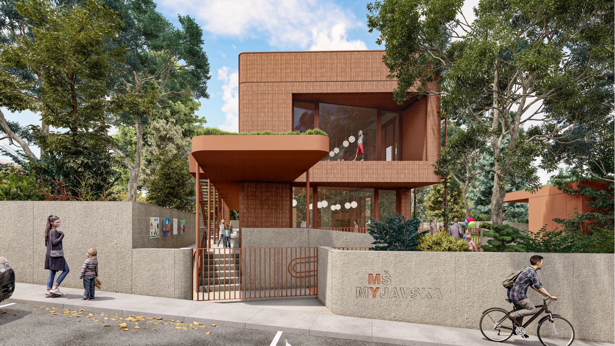 Vizualizácia noveuj škôlky na Myjavskej, ktorej výstavbe je však zatiaľ vzdialená. Mestská časť musí najprv uspieť so žiadosťou o financie z plánu obnovy.