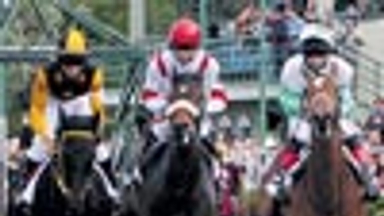 Cenu trojročných kobýl pred týždňom získala hnedka River Night s džokejom Jaroslavom Línekom (štvrtá sprava).