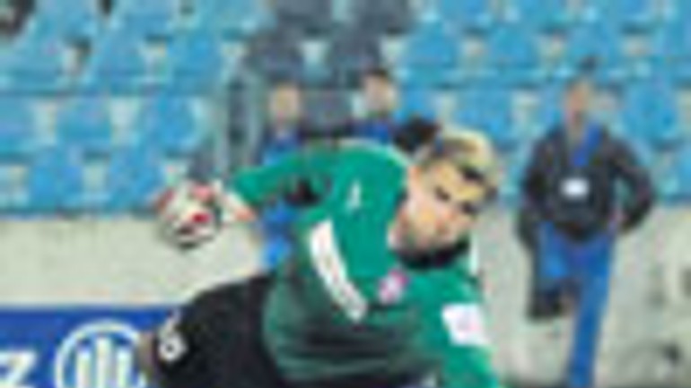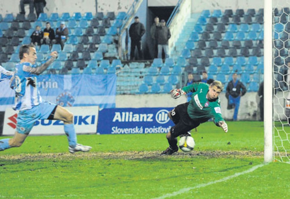 O prvý gól futbalistov Slovana do siete Zlatých Moraviec sa postaral kapitán belasých Samuel Slovák. Jeho strelu do súperovej bránky sleduje najlepší ligový strelec Pavol Masaryk.FOTO - TASR