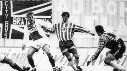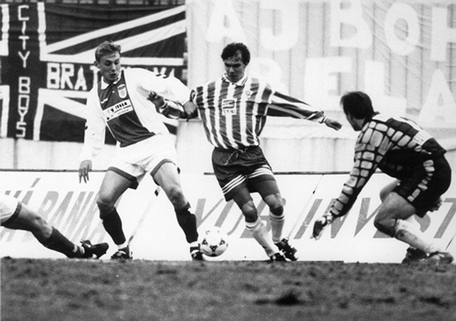 Szilárd Németh v belasom. Vľavo Tibor Zátek, v tom čase obliekajúci dres Dukly Banská Bystrica, dnes hráč Ostravy, vpravo brankár Ondruška, ktorý skúša šťastie zase v Rakúsku.