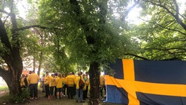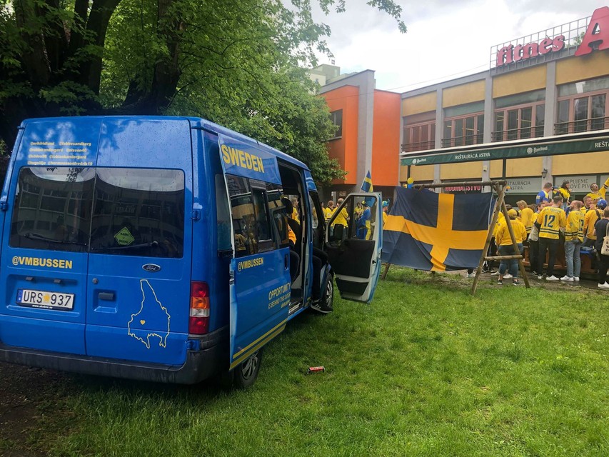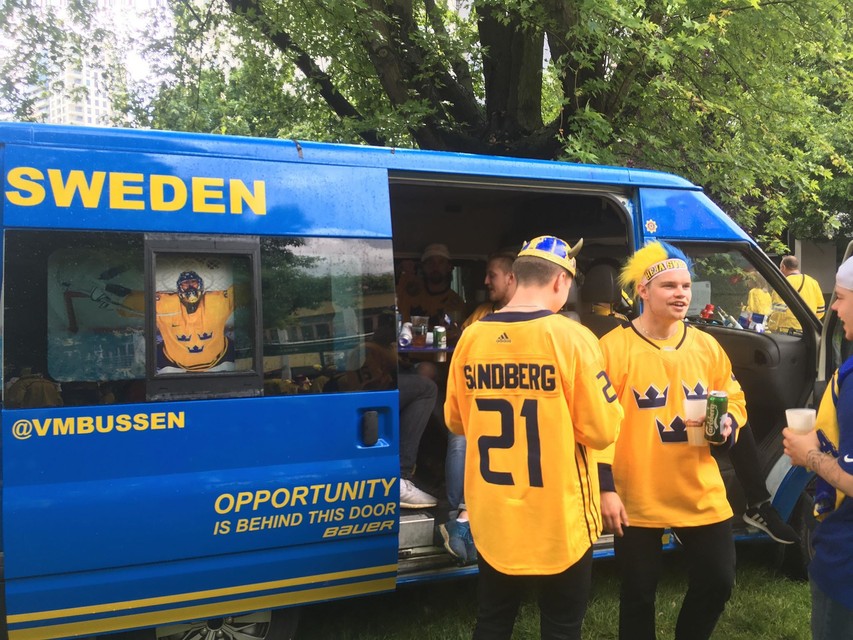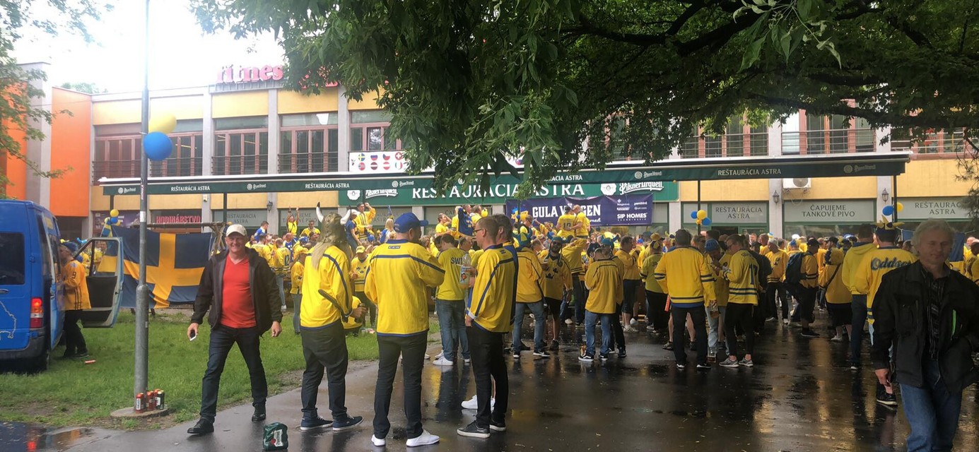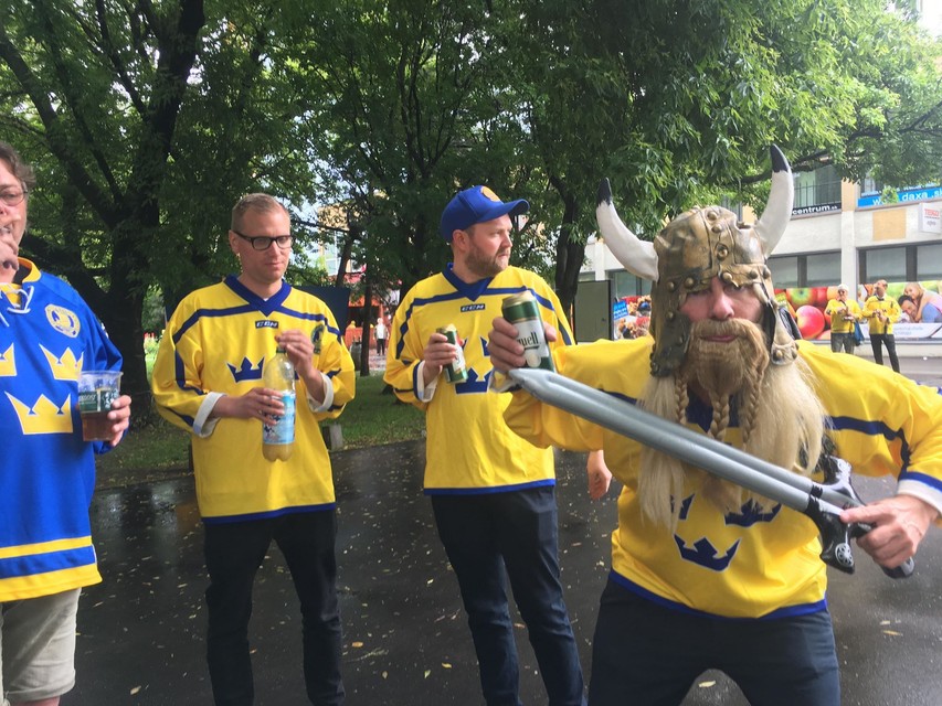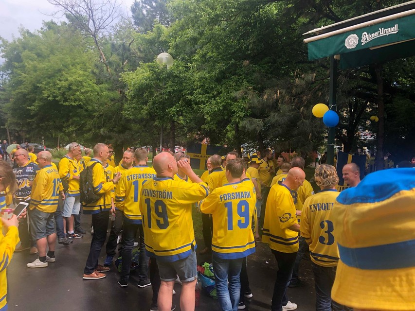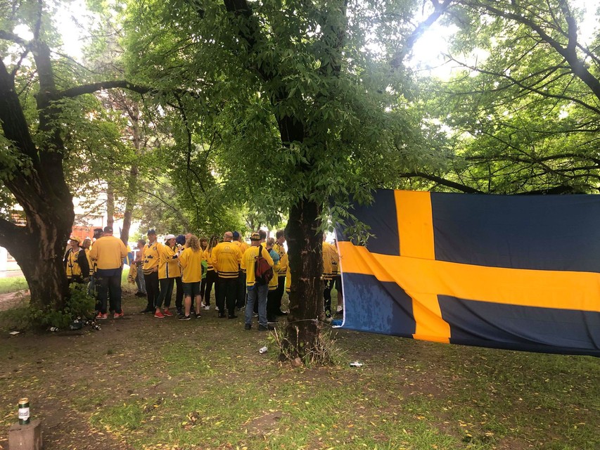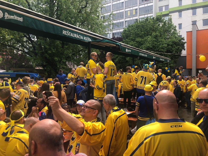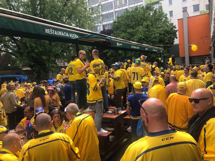 Švédski fanúšikovia boli oblečení v dresoch národných farieb a všetci s pivom v ruke družne spievali hokejové hymny. My sme sa rozprávali s fanúšikmi Thomasom a Hassom, ktorí navštívili Bratislavu prvýkrát a ubytovaní sú hoteli Mercure pri Hlavnej stanici. Vyjadrili sa, že sa im tu páči a máme dobré pivo. Bratislava je podľa nich veľmi pekné mesto a všade sa dostanú pešo. Boli veľmi milí, priateľskí, ani u ostatných sme sa nestretli s arogantným správaním. "Máme radi tento šport, u nás má svoju históriu a keďže naši hokejisti tvoria super tím, určite budeme majstri sveta," povedali nám Švédi Thomas s Haasom. Nezabudli však pochváliť aj slovenských hokejistov. Krátko po 15-tej sa všetci v dobrej športovej nálade vybrali pešo smer hokejový štadión na Trnavskú.