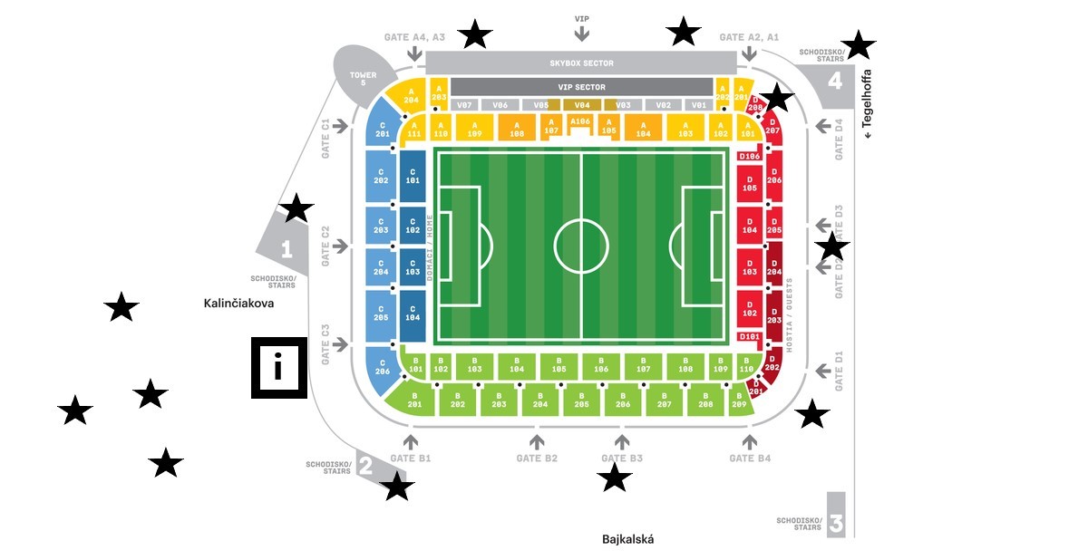 "Prosíme všetkých návštevníkov, aby sa riadili podľa schodiska a vstupu vyznačeného na vstupenke. Systém turniketov je nastavený tak, že vstup na štadión je možný len cez konkrétny gate (vstup), ktorý je vyznačený na vstupenke," upozorňuje Slovan.