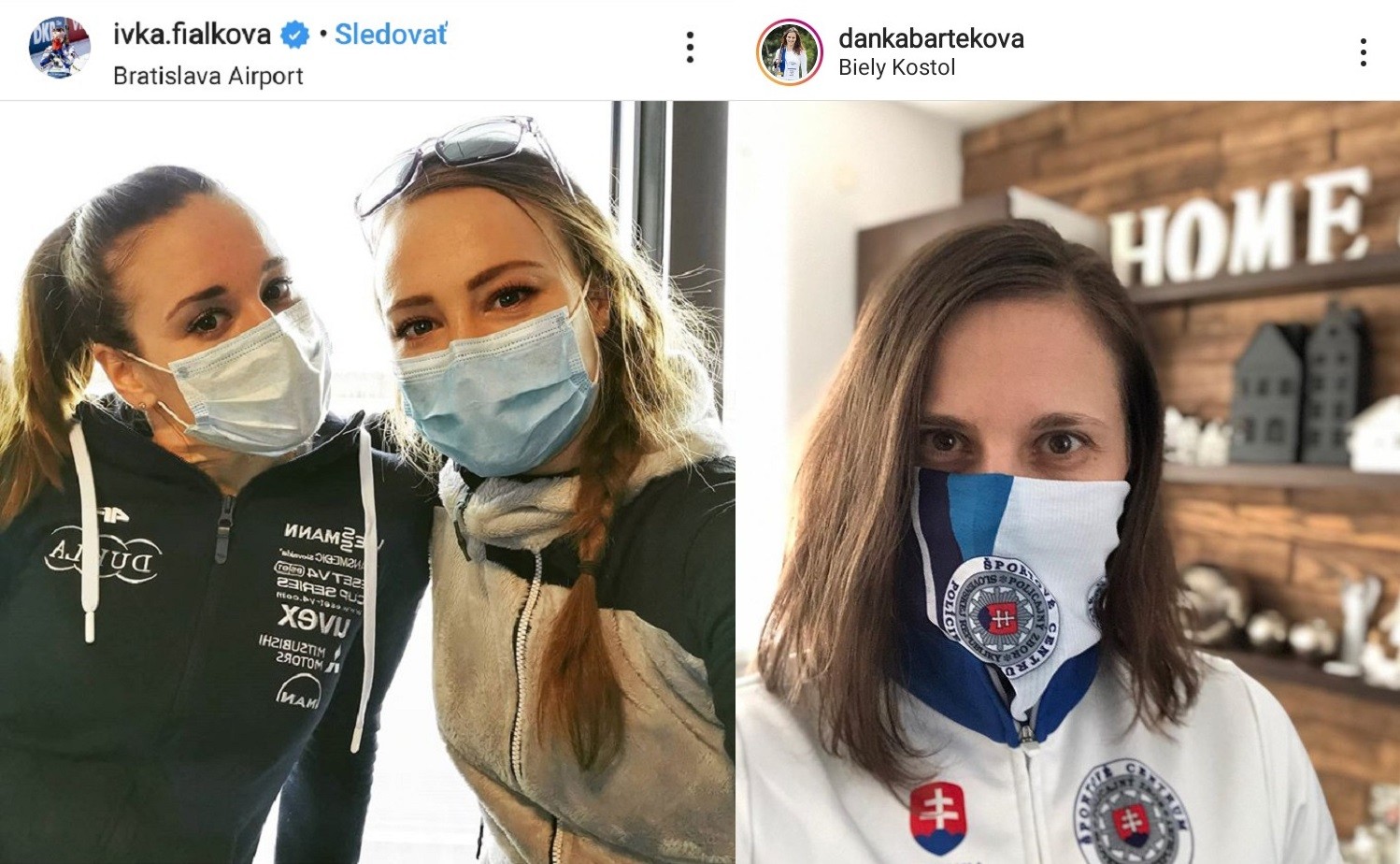 Na Slovensku sa už nachádzajú aj biatlonistky - sestry Paulína a Ivona Fialkové (vľavo), ktoré cez víkend priviezol vládny špeciál z Fínska, takže s rúškami pózovali ešte na letisku v Bratislave a takisto naša známa strelkyňa a členka MOV Danka Barteková nosí na tvári šatku aj s logom Športového centra polície.