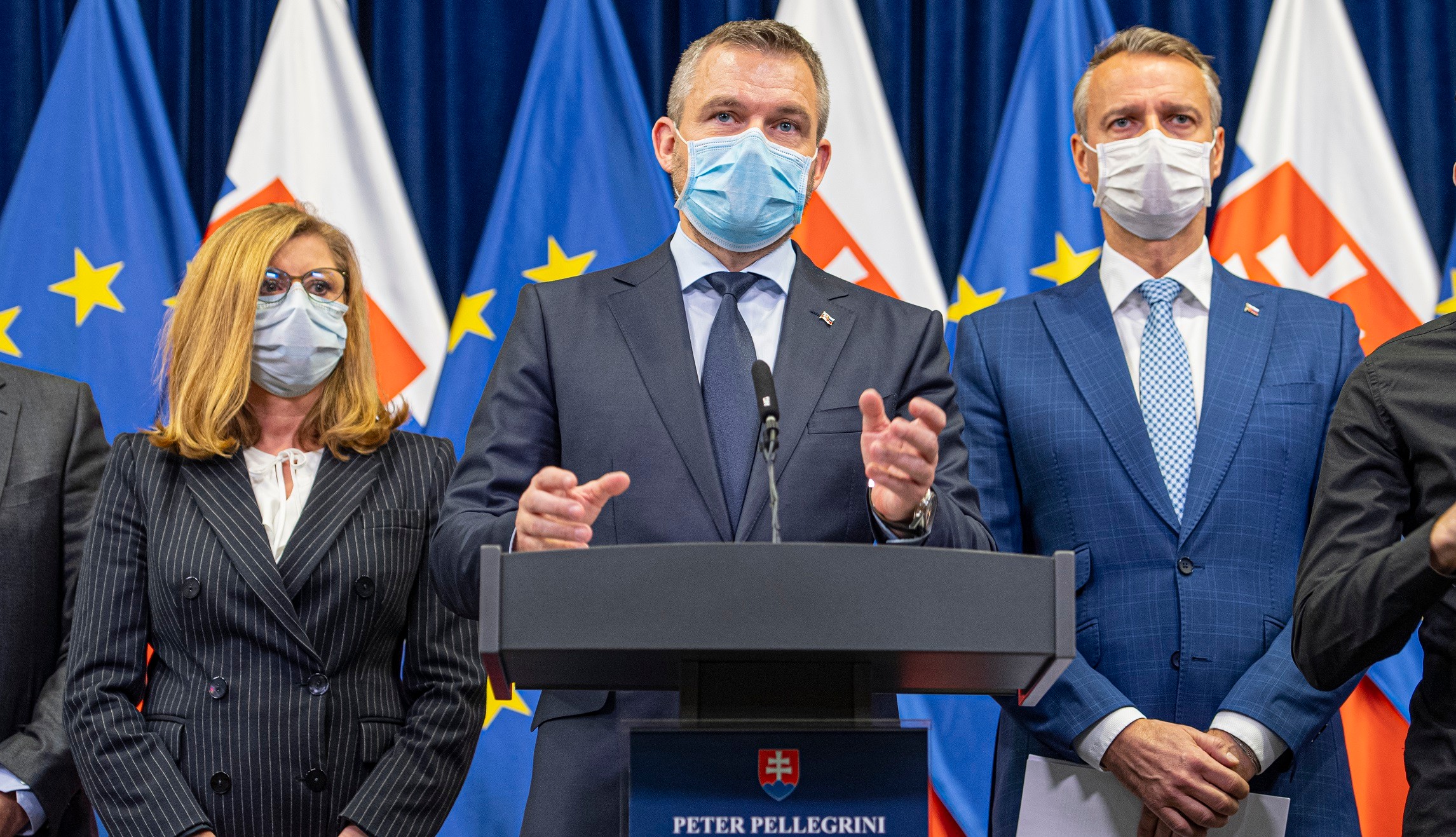 Ochranné rúško na tvári pred niekoľkými dňami začal na verejnosti nosiť aj úradujúci premiér Peter Pellegrini a počas víkendovej tlačovej besedy ich na sebe mala aj ministerka Gabriela Matečná (vľavo) či vicepremiér Richard Raši.