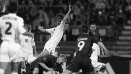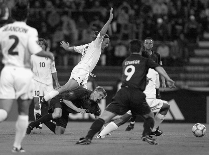 Vratislav Greško padá na trávnik po zákroku Taliana Roberta Baronia (zo zápasu Slovensko-Taliansko 1:1)