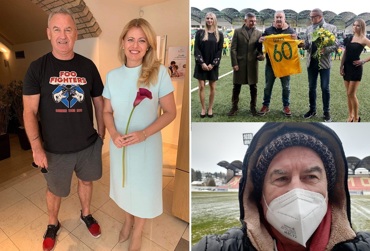 Vlado v tričku obľúbenej hudobnej skupiny s prezidentkou Zuzanou Čaputovou, pri oslave svojich 60. narodenín na štadióne v Žiline a vo februári na ligovom zápase Ružomberok - Slovan.