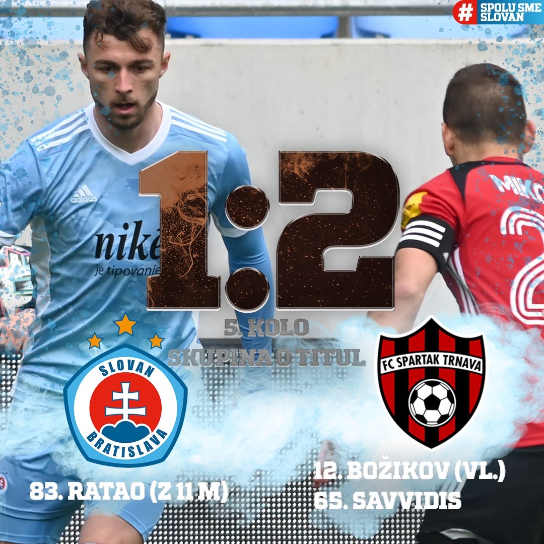 Futbalisti Slovana Bratislava prehrali so Spartakom Trnava 1:2 v sobotňajšom 159. derby v rámci 5. kola nadstavby Fortuna ligy 2020/2021 v skupine o titul. Obhajca titulu a suverénny líder tabuľky prehral len tretí ligový duel v tejto sezóne, Trnava natiahla víťaznú sériu vo FL na štyri zápasy.