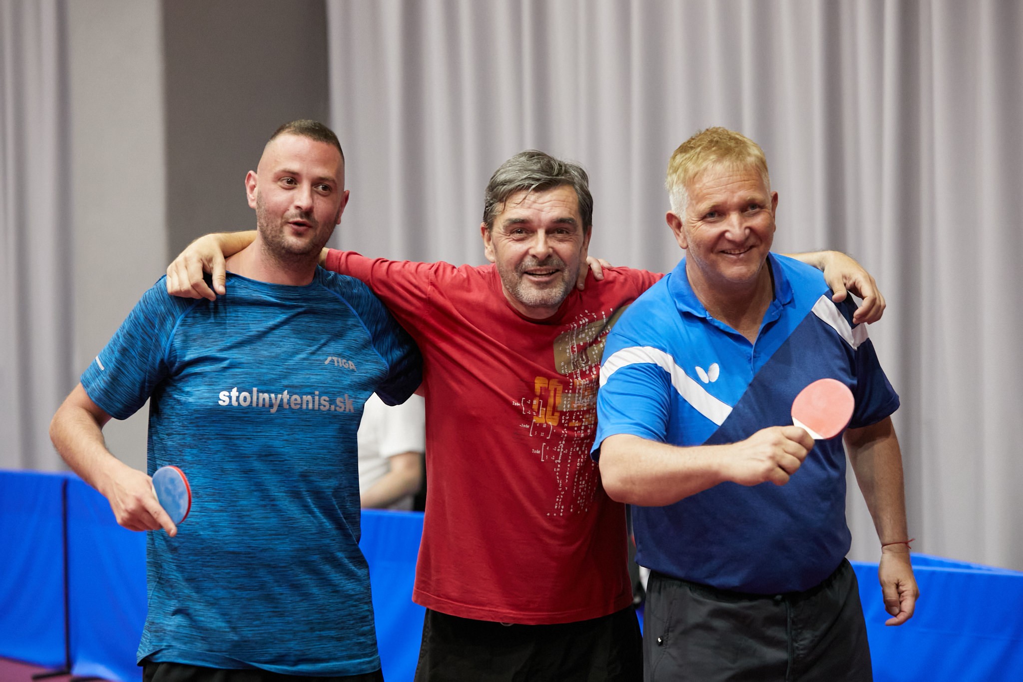 Súčasťou turnaja Múzy za stolom bolo exhibičné vystúpenie Old Stars, v ktorom sa predstavili bývalí profesionálni hráči. Jedným z nich bol aj šesťnásobný majster Slovenska Zoltán Lelkeš - na snímke vľavo s organizátorom turnaja Nikitom Slovákom (vpravo), ktorý hrá v súčasnosti druhú ligu v stolnom tenise, takže v turnaji neštartoval, ale predstavil sa v rámci spomínanej exhibície a absolvoval aj priateľský zápas s Petrom Kočišom (v strede).