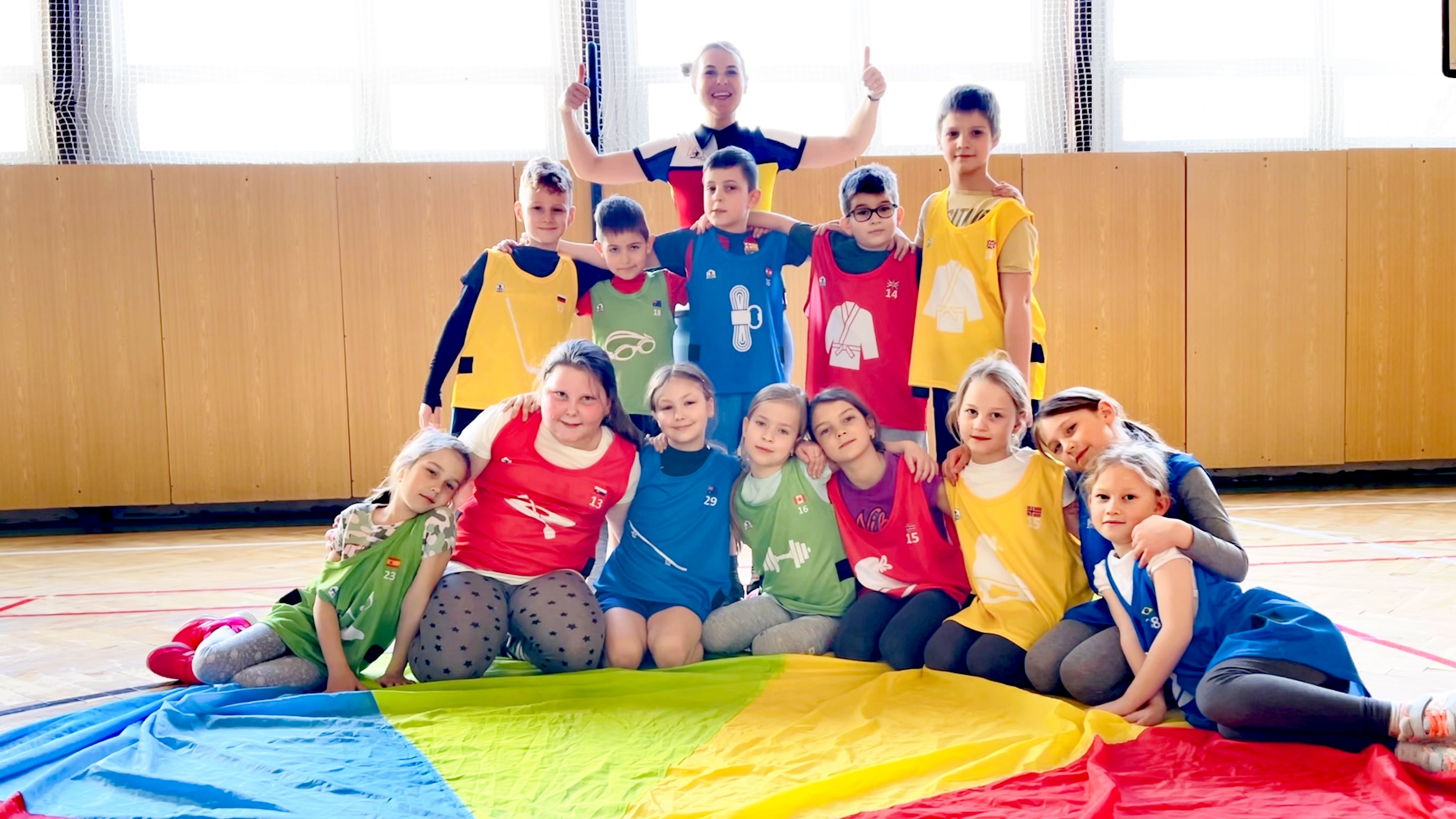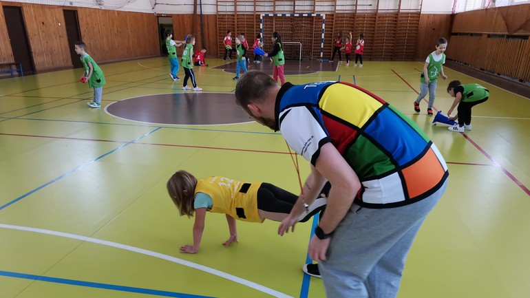Každá hodina je iná a na každej majú deti iné pomôcky. Lopty, penové raketky, ktorými sa dá hádzať ako oštepom, prekážky, šatky, rebríky na preskakovanie, džudo pásy na preťahovanie, pogumované ruky a nohy na vytvorenie dráhy, kruhy väčšie aj menšie, aby si dieťa vedelo vybrať, do ktorého si trúfne hádzať, dokonca škrabošky – to keď treba odizolovať najdôležitejší zmysel... Alebo veľké plyšové kocky. Jednu vezme trénerka, druhú učiteľka, obe hodia, rozdiel čísel je pre deti signál koľkočlennú skupinku treba vytvoriť. Že je to matematika? Nie. Je to telesná výchova.