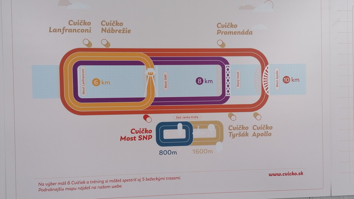 Nové ihriská - cvičká – sa nachádzajú na nábrežiach Dunaja, spojené sú bežeckými okruhmi. Popri rieke tak vznikli nové športové stanovištia: Cvičko Lanfranconi, Cvičko Nábrežie, Cvičko Most SNP, Cvičko Promenáda, Cvičko Tyršák a Cvičko Apollo. Na všetkých sú umiestnené info tabule s popisom a tipmi, ako správne cvičiť a využívať jednotlivé prvky. Podrobný popis možných tréningov na každé jedno z cvičiek pripravil profesionálny tréner Maroš Molnár.