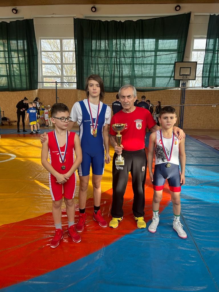 Nové zápasnícke nádeje s trénerom Milanom Machom. Druhá zľava Tamara Sedláková, vpravo Čermen Kertanti.