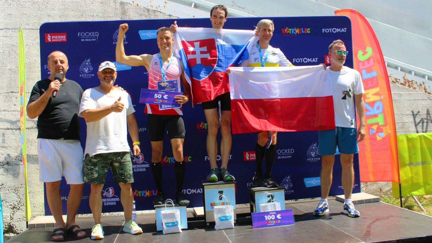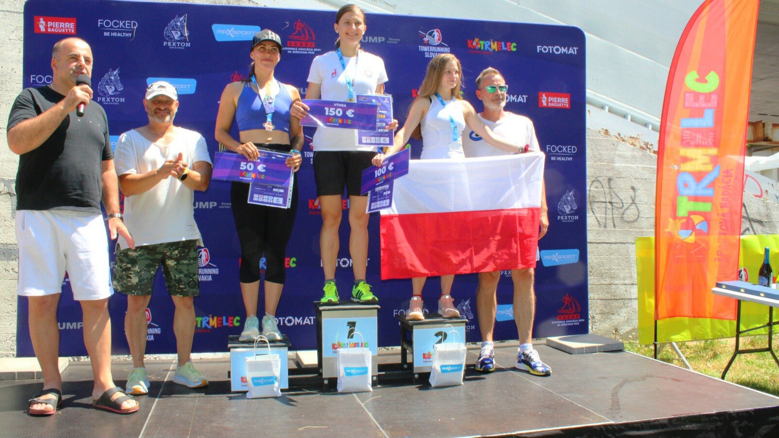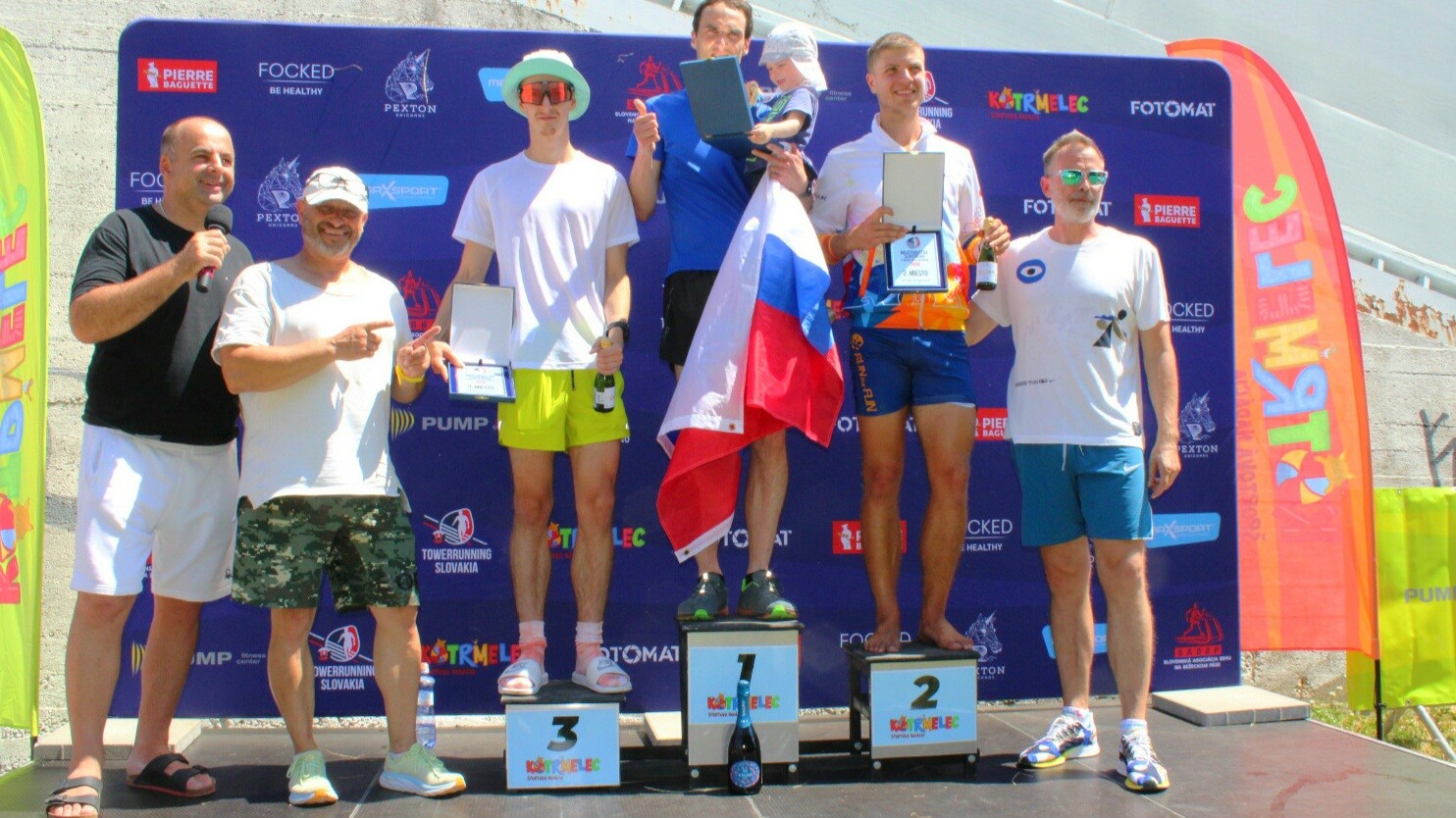 Majster a majsterka Slovenska v behu do schodov Štefan Štefina a Kamila Chomaničová. V strede prezident World Towerrunning Association Daniel Čečetka.