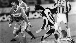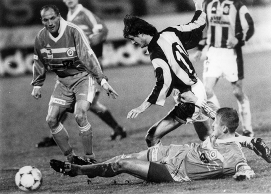 Na jesenný súboj Slovana s 1. FC budú belasí ešte dlho v dobrom spomínať (vľavo Pecko, na zemi Tomaschek, v strede Košičan Zvara).