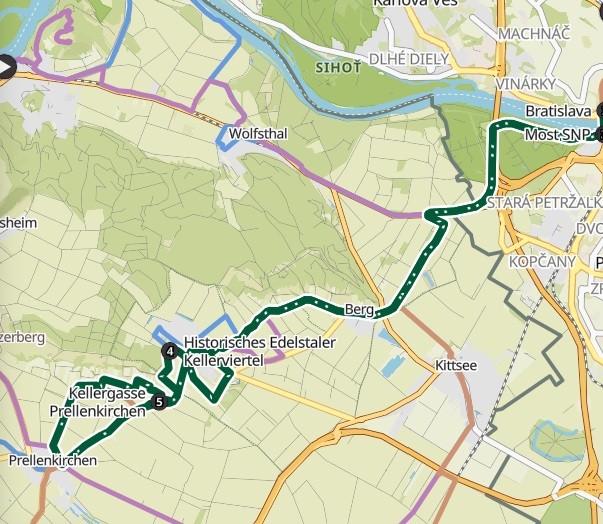 Keď vyrazíte spod mosta SNP po cyklotrase sa pohodlne dostanete až po hraničný priechod Berg, kde zabočíte doľava na cestu L2239 a pokračujete po tejto ceste určenej len pre domácich vodičov a poľnohospodárske stroje do dedinky Berg. "Odtiaľ prejdete popri nádherných viniciach po pravej strane a poliach s veternými mlynmi po ľavej strane do Edelstalu. Cesta z Edelstalu vedie cez malý kopček priamo ku Kellergasse," radí Kamila.