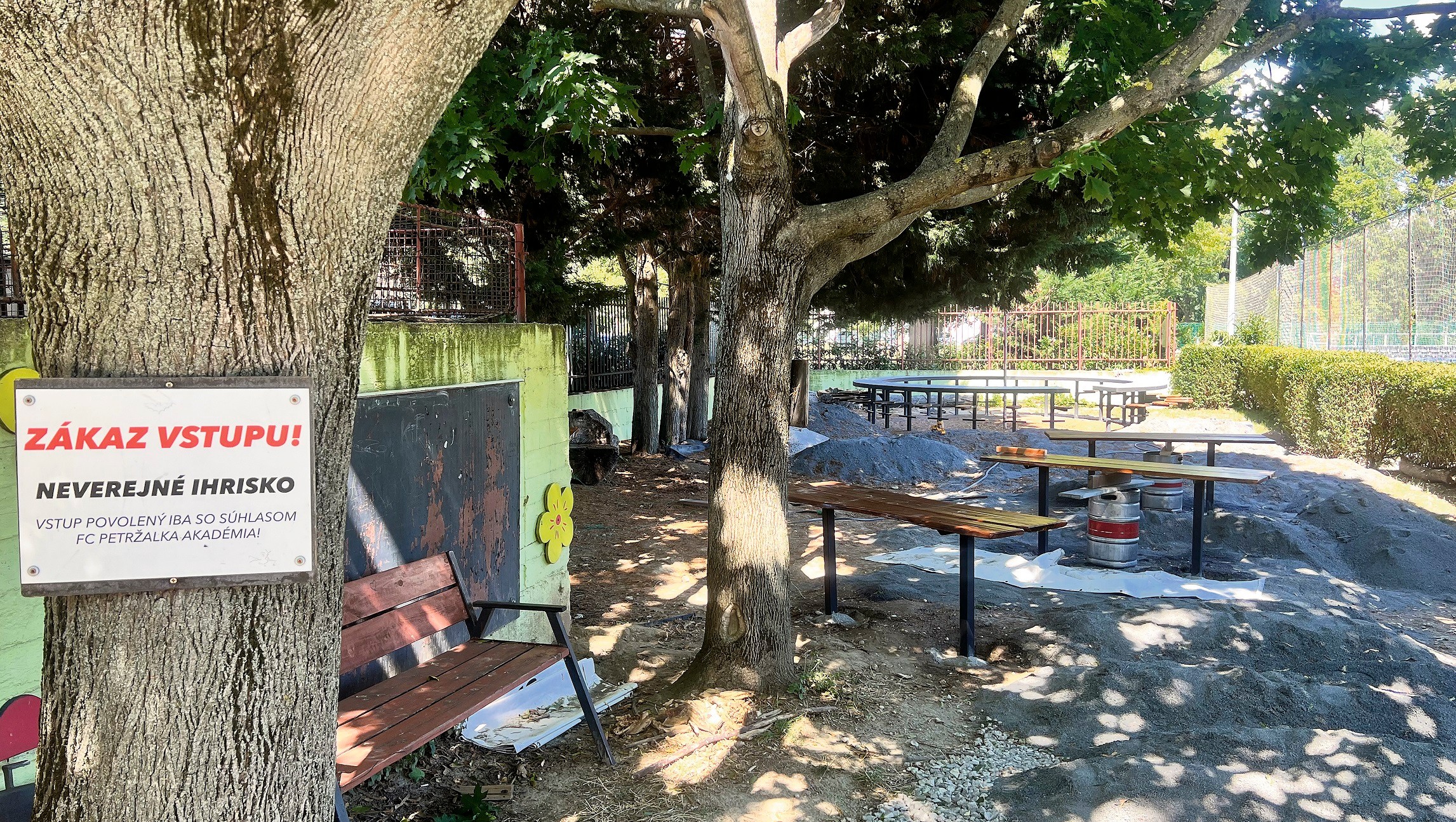 V areáli na ZŠ Sklodowskej bolo ešte počas pandémie hneď vedľa malé ihrisko s trampolínou. Miestni sa však naň nedostali. Čitateľka nám vtedy do redakcie napísala, že jej povedali, že je to umožnené len deťom z francúzskej školy. Aká je situácia dnes? Ešte dnes tu nájdete tabuľu zákaz vstupu – neverejné ihrisko. Ihrisko je však zrušené, mení sa na priestor na sedenie. Nájdete tu zákaz vstupu na hraciu plochu a ďalší zákaz vstupu na zadné detské ihrisko. Areál je však otvorený a nikto vás nevyženie, keď prídete aj mimo ligového zápasu a budete si chcieť pozrieť tréning futbalistov.