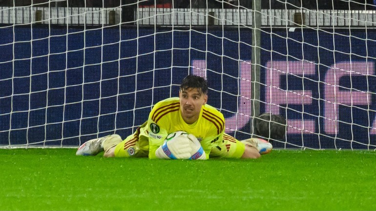Brankár Slovana Dominik Takáč počas zápasu 2. kola ligovej fázy Konferenčnej ligy vo futbale AZ AlkmaarVýborný výkon slovenského futbalového brankára Dominika Takáča držal ŠK Slovan Bratislava nad vodou na pôde holandského Alkmaaru. V druhom kole Konferenčnej ligy UEFA pustil Takáč za svoj chrbát iba jediný z 11 streleckých pokusov a „belasým“ dal šancu uspieť aj zlikvidovanou penaltou v závere prvého dejstva duelu, v ktorom sériový slovenský šampión napokon prehral 0:1.