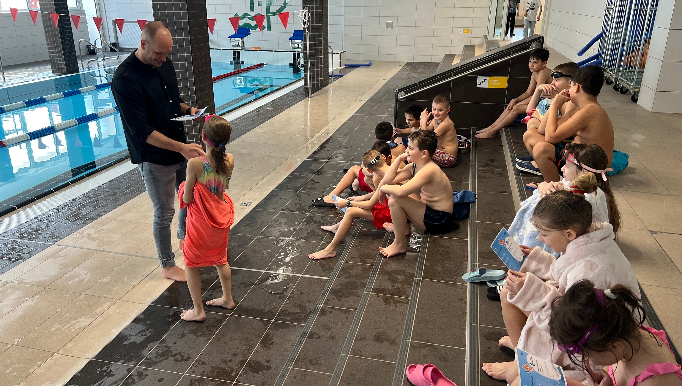 Ich nadšenie ma až prekvapí. Spomínam si, že keď sme mali kedysi dávno v treťom ročníku povinný plavecký kurz, na konci každej hodiny väčšina z nás drkotala zubami a chcela ísť len do teplej sprchy. Pýtam sa Laury a Dominiky, či im nebola vo vode zima. „Nie, bola teplá,“ hovoria. V županoch sedia v pohode na schodoch a čakajú na svoje mokré vysvedčenia, ale keby sa dalo, ešte by boli v bazéne. Takže pán vrátnik, ktorého som stretla pri vstupe do školy, nepreháňal, keď mi hovoril, ako sa deti tešia do bazéna. „Dnes plávame štafetu!“ chválili sa mu. Celý týždeň plnili úlohy trénerov a dnes ich čakala kolektívna 10-minútová štafeta. Nebojovali medzi sebou, ale ako tím, ktorý chce pre svoju triedu čo najviac odplávaných metrov. Väčšina detí chce plávať, už to je pre mňa zážitok