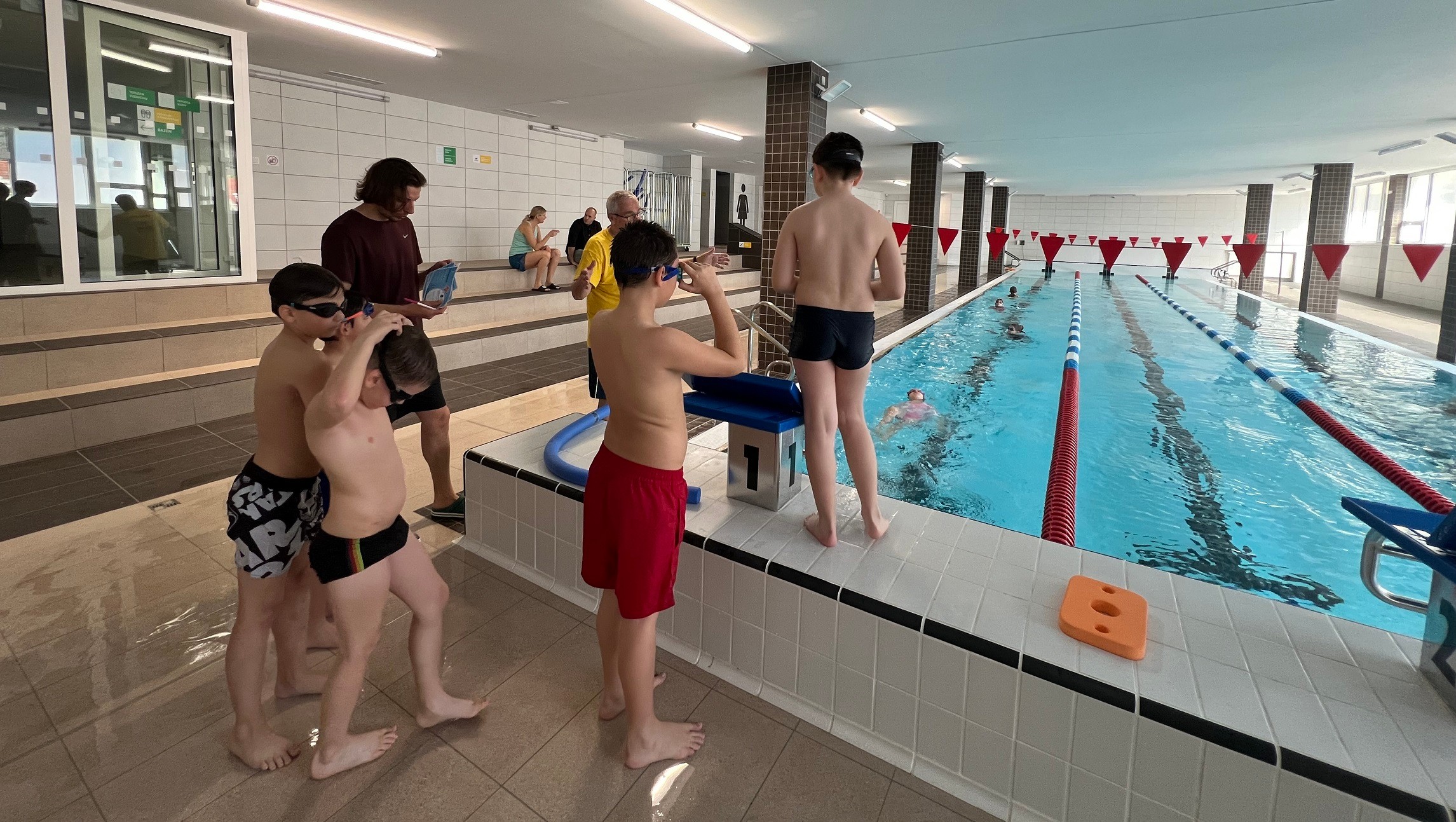 „To sa dokázali naučiť za päť 60-minútových lekcií?“ pýtam sa nedôverčivo Rastislava Bielika. „Keď prichádzajú na kurz, tak 80 percent z nich nevie preplávať 25 metrov. A keď odchádzajú, tak 80 percent to už vie,“ reaguje a vysvetľuje, že primárne ich učia, aby dokázali vzdialenosť preplávať na chrbte, teda v plaveckom štýle znak, pretože počas neho môžu voľne dýchať. Kto to zvládne, prechádza aj na kraul. „Už som trocha vedel plávať,“ hovorí nám tretiak Marek. „Ale tu som sa naučil znak a aj dlhšie plávať pod vodou a lepšie skákať šípku.“