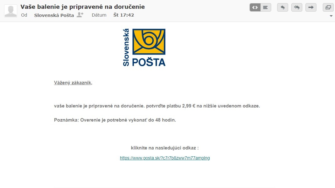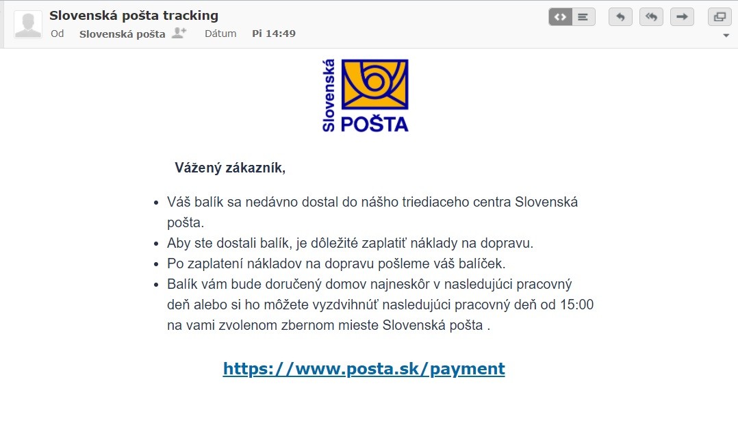 "Odosielateľ používa zdeformované logo Slovenskej pošty a od adresátov pýta poplatok za doručenie zásielky. Ich odosielateľom nie je Slovenská pošta, a preto by ste nemali na takéto maily reagovať. Ide o podvod, kde je zneužité meno Slovenskej pošty, preto sa Slovenská pošta obrátila na orgány činné v trestnom konaní," uvádza sa na jej webstránke, kde verejnosti objasňuje, prečo ide o evidentný podvod.