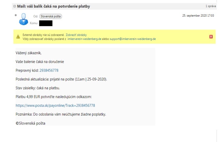 V posledných dňoch doslova zaplavili mailové schránky Slovákov falošné maily, ktorých odosielateľom by mala byť podľa použitého loga Slovenská pošta. Avšak ide o podvodníkov, ktorí zneužívajú jej značku a snažia sa vymámiť od ľudí peniaze za doručenie balíka. Pošta pred týmito praktikami varuje aj na svojej webovej stránke a upozorňuje ľudí, aby si dali veľký pozor a nenaleteli...