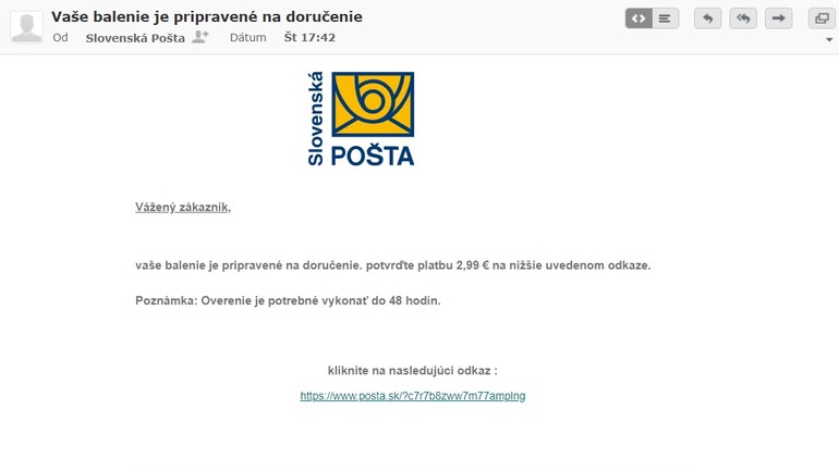 Okrem toho sa stále objavujú falošné e-maily či SMS správy pod hlavičkou Slovenskej pošty, požadujúce od adresátov úhrady poplatkov za doručenie zásielky či preclenie zásielky. Ak klient akceptuje túto falošnú požiadavku, webový odkaz ho presmeruje rovno na platobnú bránu, kde má zadať údaje zo svoje platobnej karty. Klienti by sa mali mať na pozore, pretože ani v tomto prípade nie je odosielateľom Slovenská pošta. Slovenská pošta nikdy nežiada poplatky prostredníctvom e-mailov či SMS, a to ani pri colnom konaní. Clo aj poplatok za colné konanie zaplatí klient priamo pri doručení zásielky.