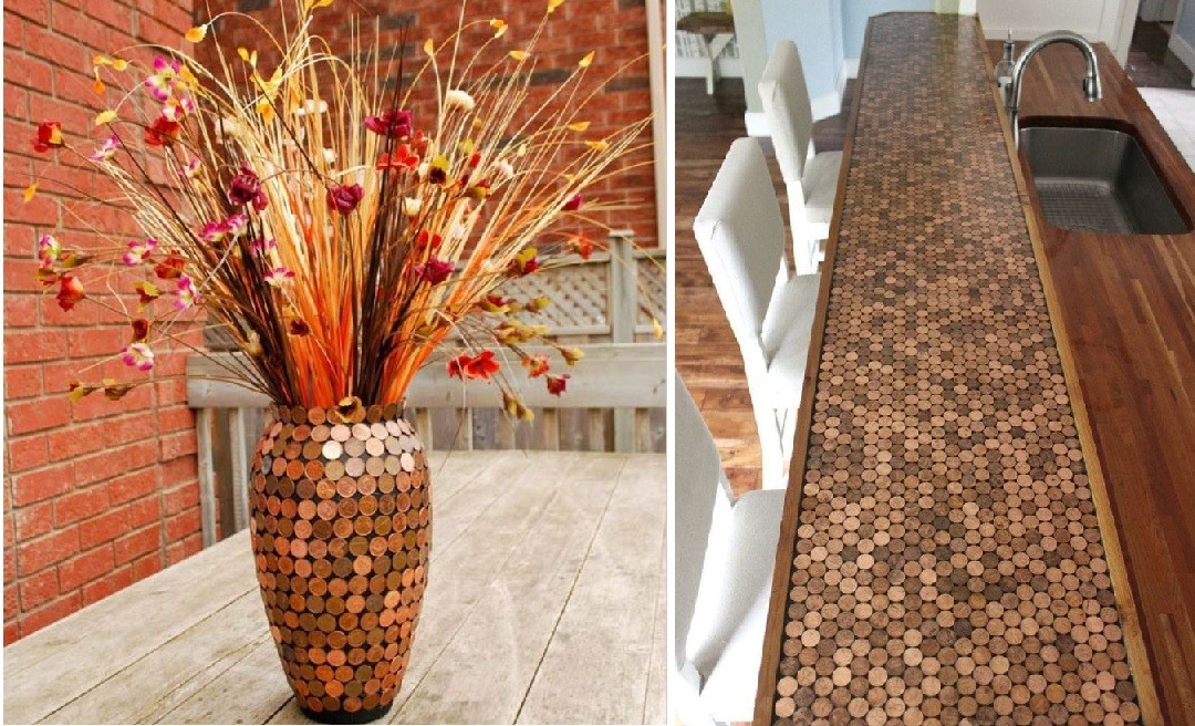 Centové mince sa už využili ako výzdoba na podlahovú vázu alebo dekoráciu jedálenského pultu...